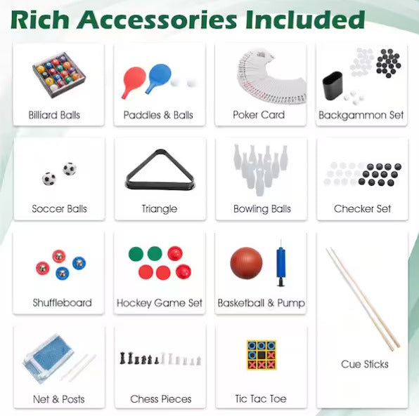 - 14-game options: this combo game table set comes with 7-ball games, including basketball, billiard, foosball, table tennis, shuffleboard, bowling and hockey, apart from that, there are puzzle and fun board games for hours of fun: chess, checkers, ring toss, horseshoes, poker, backgammon and tic tac toe