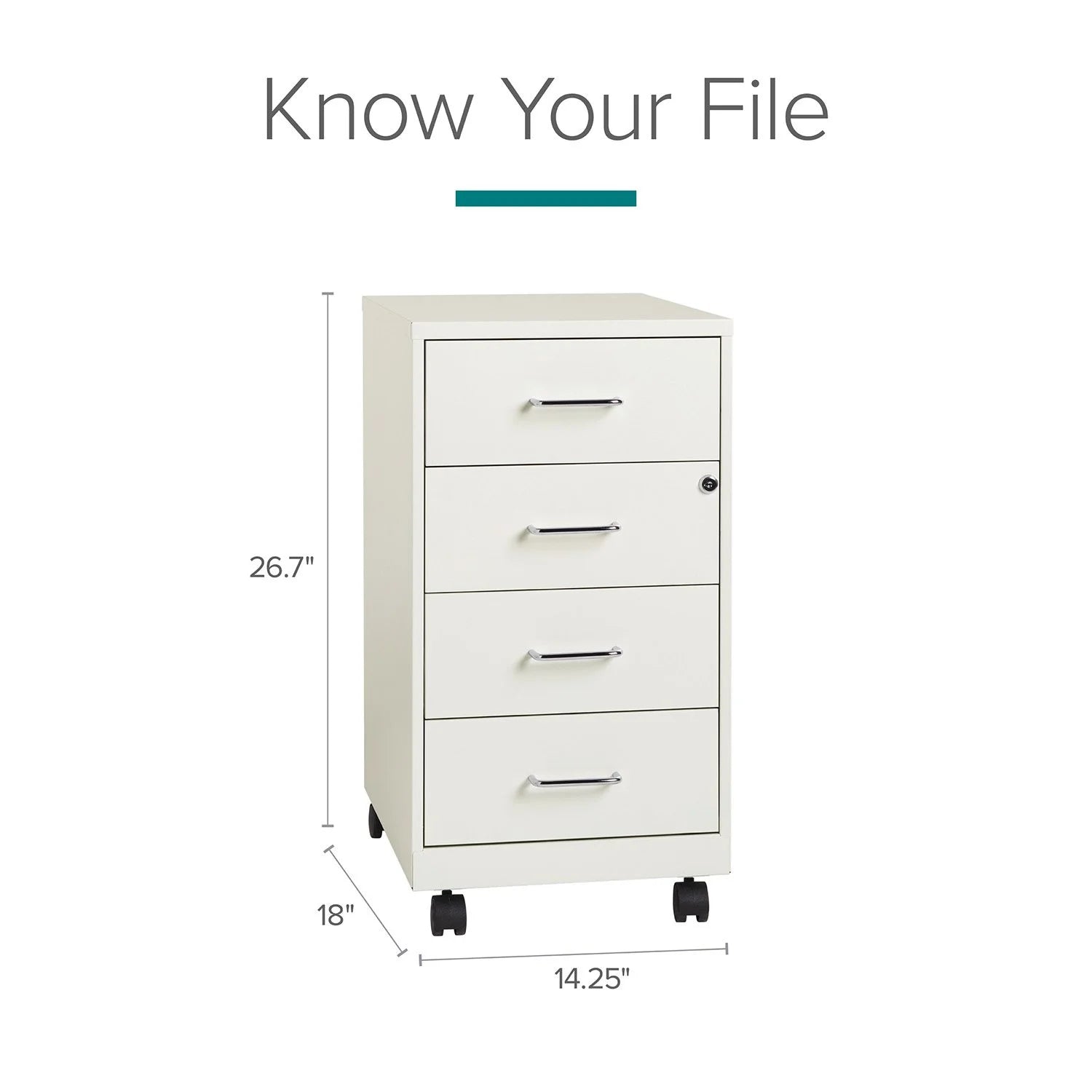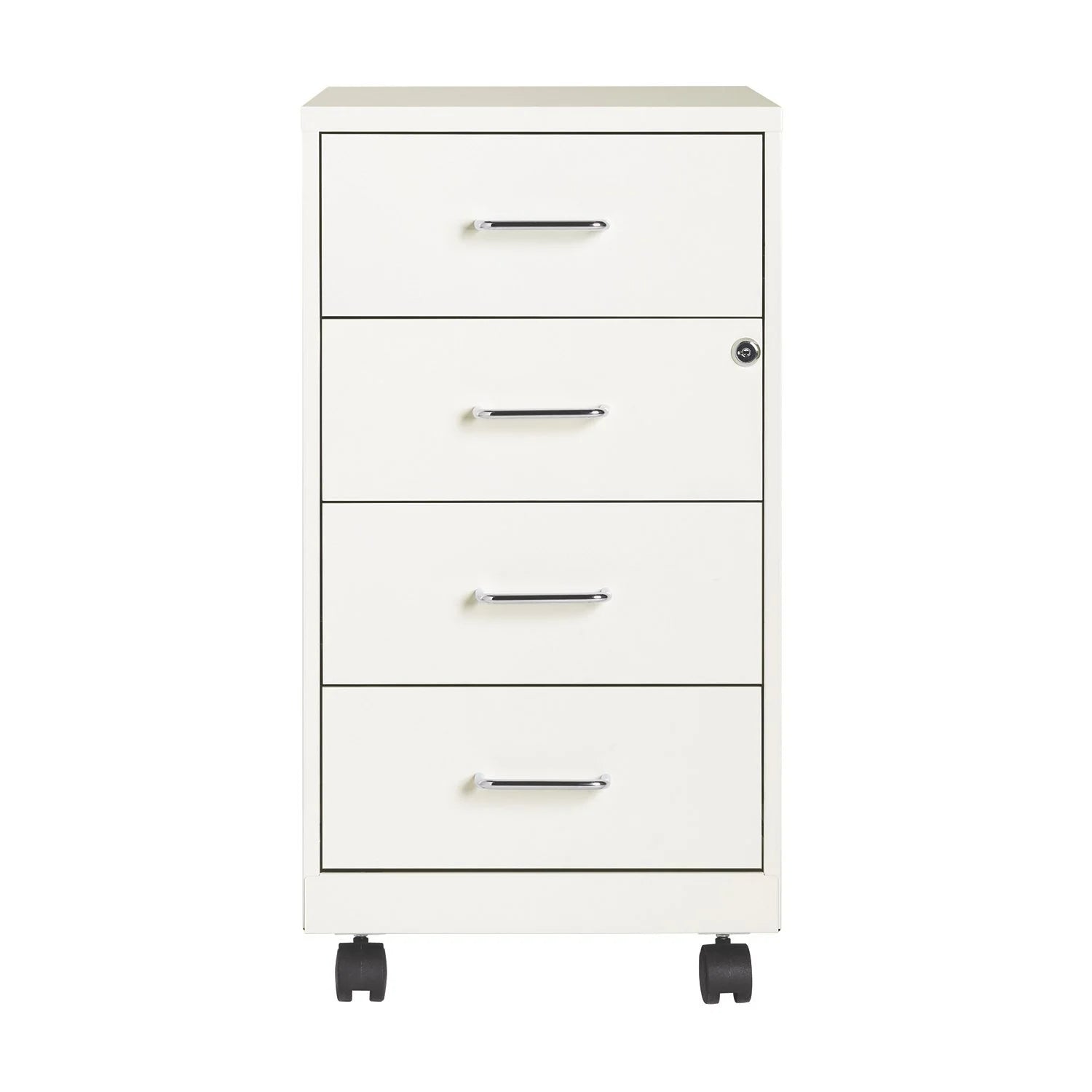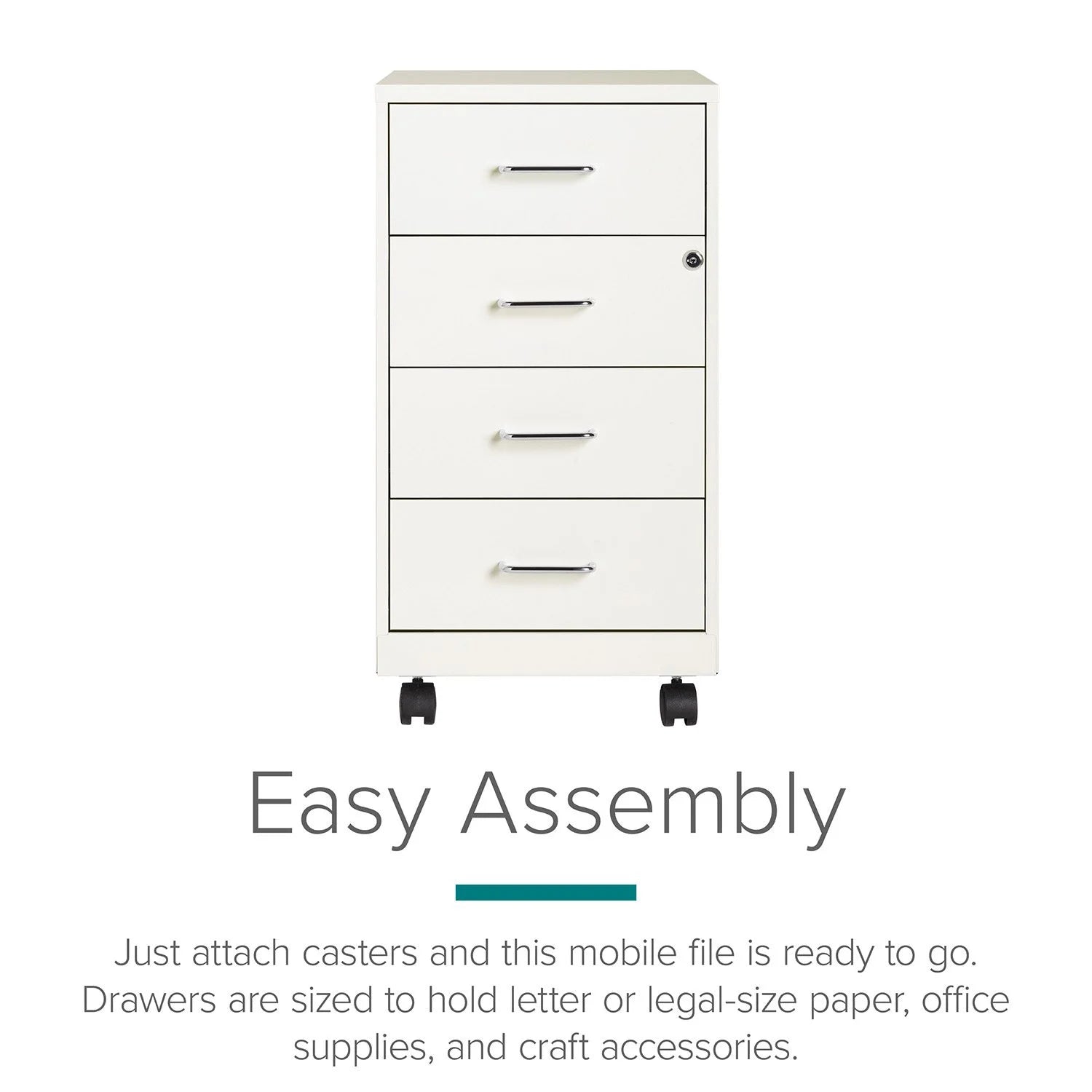 The 18" Deep 4-Drawer Metal Mobile Organizer offers a refined solution for efficient storage in compact office or home settings. Crafted from durable painted steel, its four utility box drawers glide smoothly on patented suspension systems, ensuring easy access with three-quarter extension. The top two drawers secure contents with a built-in cam lock, providing peace of mind. Its non-porous surface simplifies cleaning, blending functionality with sleek design to keep your workspace orderly and elegant.