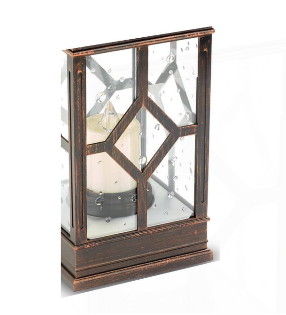 - Pillar candle inside lantern contains 1 amber LED for a warm glowing effect