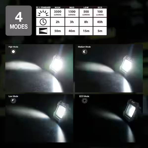 - Specifications: High mode: 3500-Lumens / 2 hours run time / 50m beam throw; Medium mode: 1500-Lumens / 3 hours run time /40m beam throw; Low mode: 500-Lumens / 8 hours run time / 15m beam throw; Eco mode: 100-Lumens / 40 hours run time / 5m beam throw