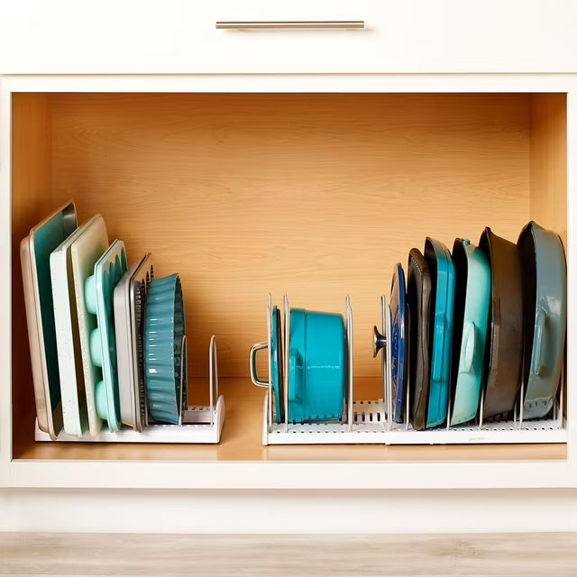 - Customizes Your Space: The Expandable Cookware Rack expands up to 22" to fit in any lower cabinet or pantry and includes 10 adjustable dividers to organize all your cookware