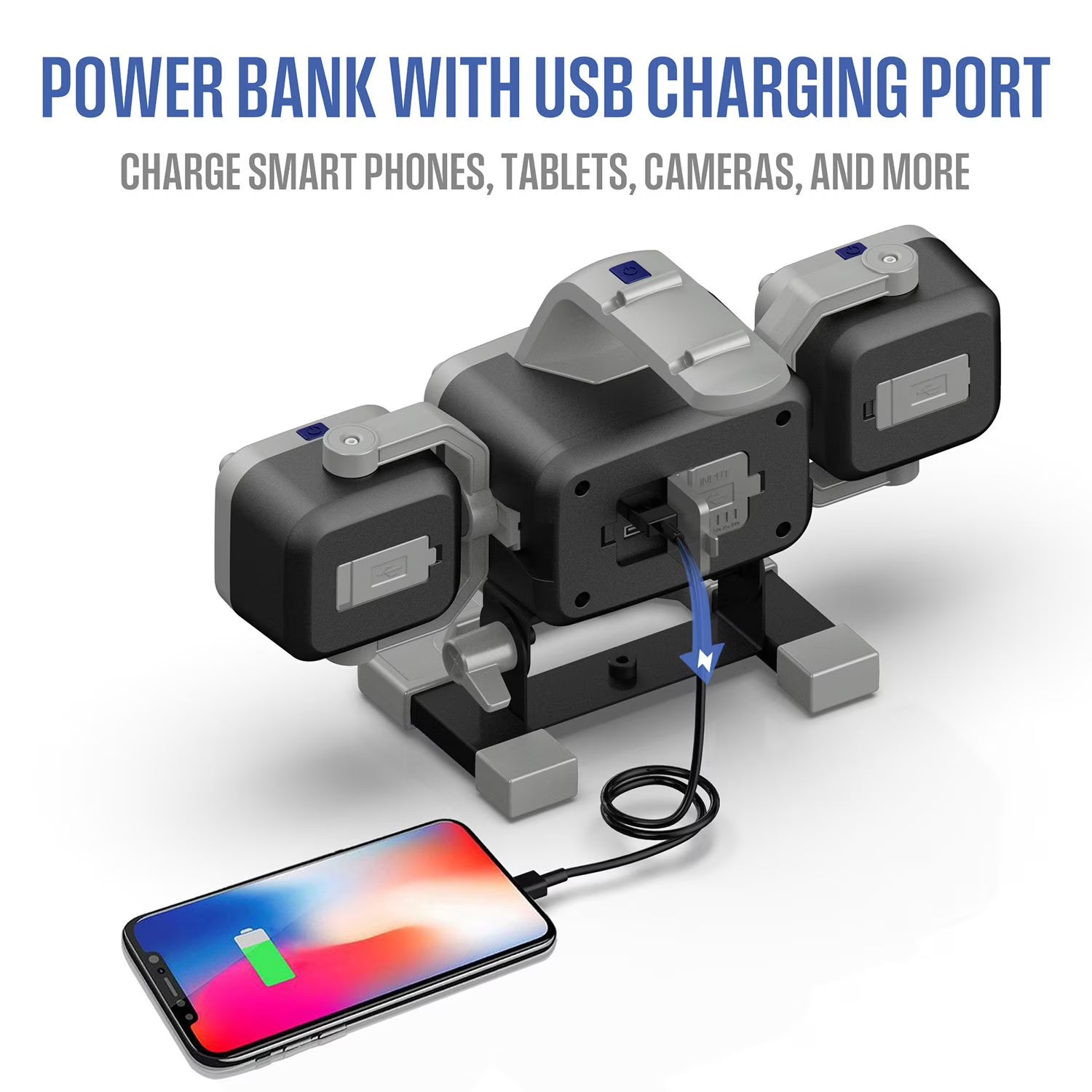 - Power bank with USB charging port to charge smart phones, tablets, cameras, and more
