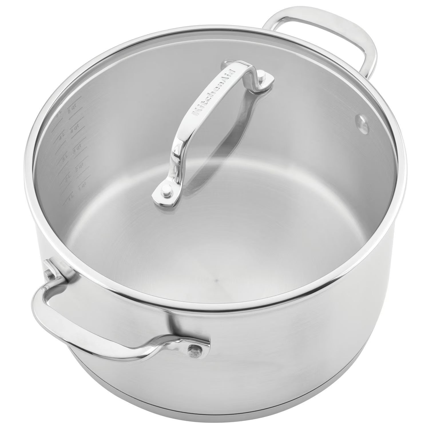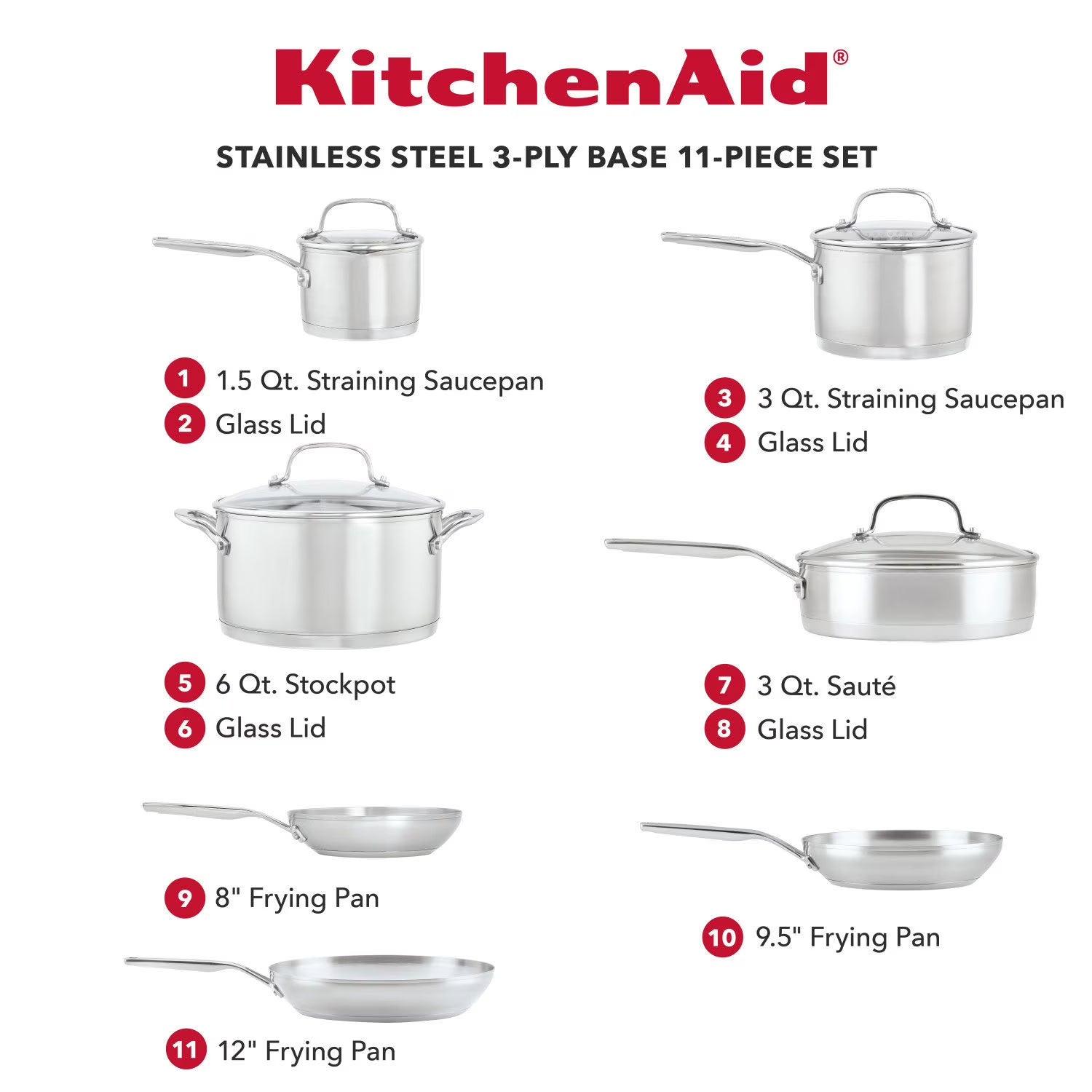 Elevate your culinary skills with the KitchenAid 3 Ply Base Stainless Steel 11 Piece Cookware Set, crafted for professional-level cooking. Featuring a brushed stainless steel exterior and an innovative 3-ply base, this set includes an extra-thick aluminum core that ensures rapid and uniform heat distribution, effectively eliminating hot spots across the surface. Each piece is designed for optimal heat retention and precise temperature control, allowing you to master a wide range of cooking techniques—from searing to simmering. The durable construction provides long-lasting performance, while the polished finish offers a sleek and modern aesthetic that complements any kitchen. This comprehensive set equips you with everything needed to prepare complex dishes with confidence and consistency.