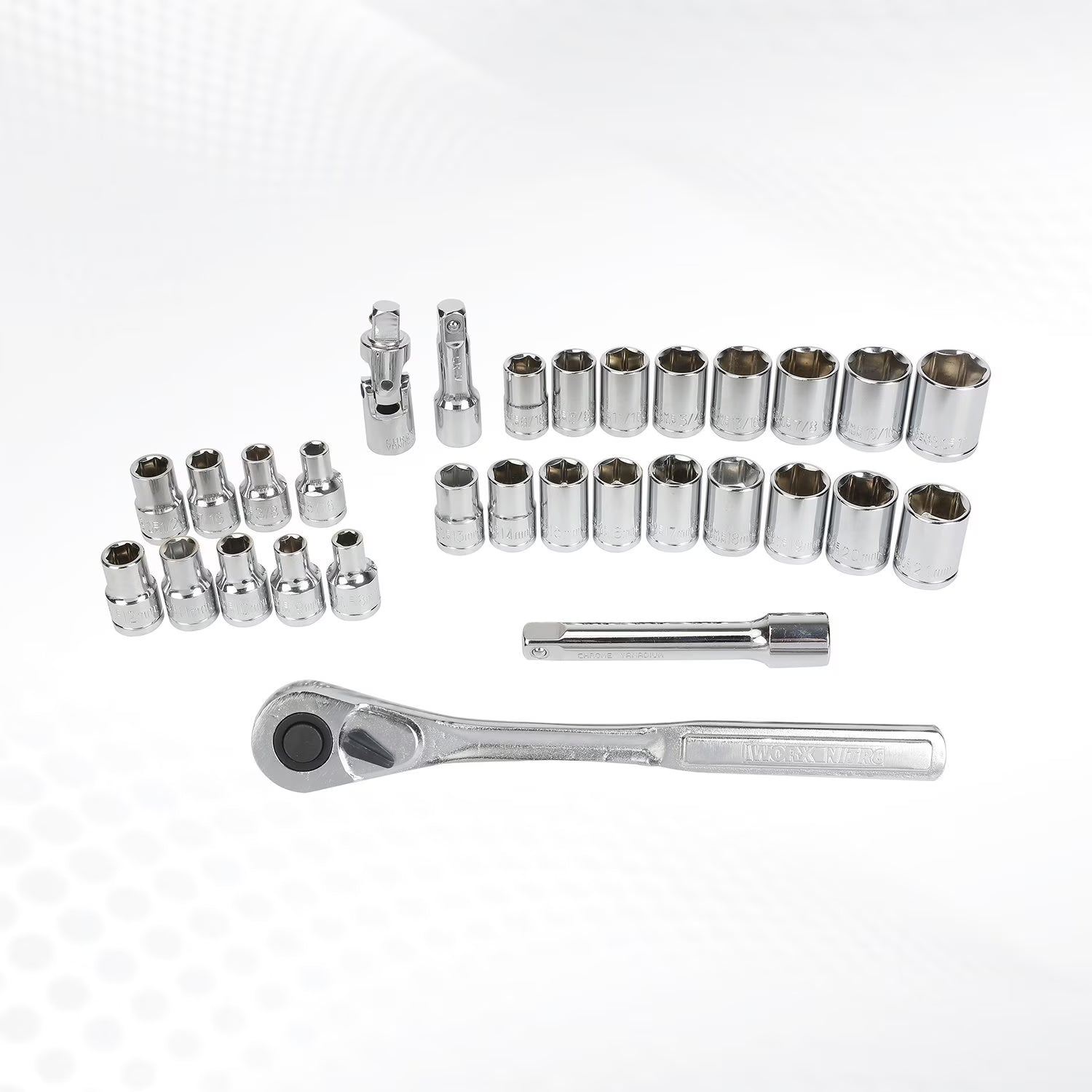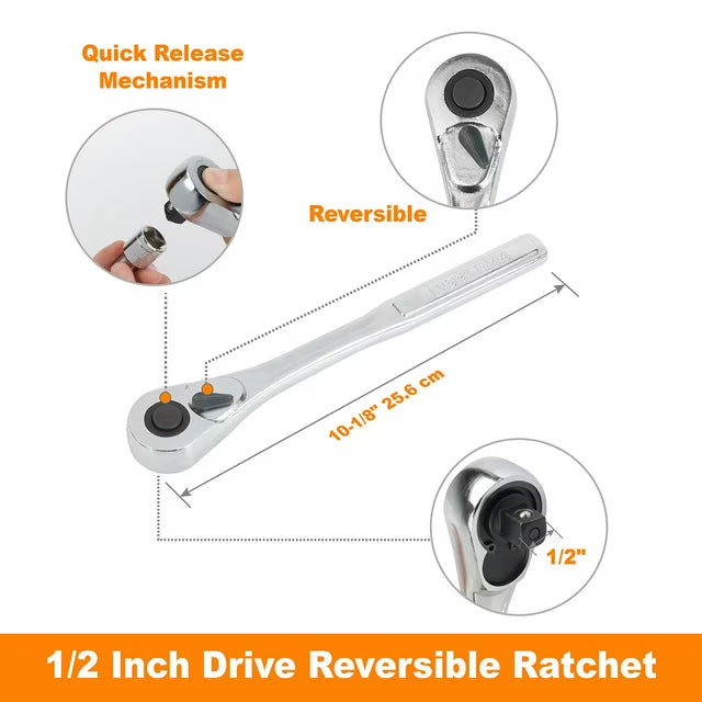 - 1/2 Drive: 12PC 6pt SAE socket: 5/16", 3/8", 7/16", 1/2", 9/16", 5/8", 11/16", 3/4", 13/16", 7/8", 15/16", 1"