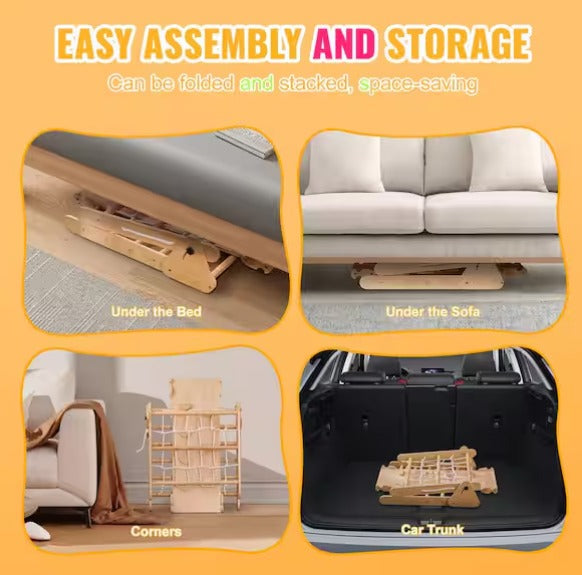 Inspired by Montessori learning principles, this 4-in-1 climbing set transforms your space into an active play environment for toddlers aged 1-3. The system combines a multi-sided triangle climber with interchangeable ramp configurations, delivering four distinct play setups that grow with your child's developing skills. Constructed from premium pine wood with thick, sturdy bars and a 160 lb weight capacity, the set withstands rigorous play from multiple children. Safety is engineered throughout: polished surfaces eliminate splinters, rounded edges prevent injury, closely-spaced bars reduce entrapment risks, and rotational prevention mechanisms secure the wooden rods, Kids climbing Toy Set. The adjustable triangle angle enables quick folding for compact storage, while clear assembly instructions and labeled components ensure straightforward setup. This durable investment supports balance development, physical confidence, and independent exploration during critical early childhood years.