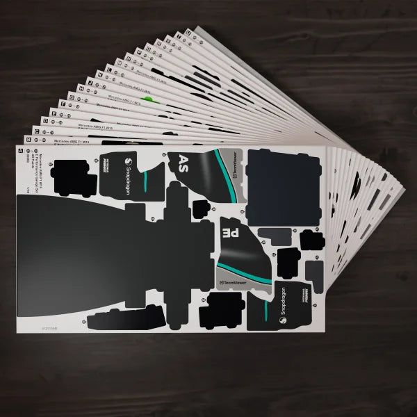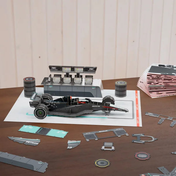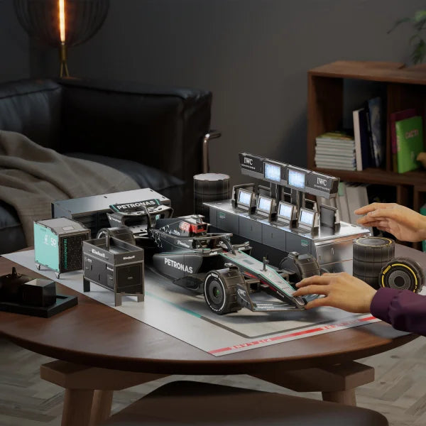 This 4D Build Mercedes W15 Garage Set is revving up to be displayed on your shelf. Embark on a Formula 1 building adventure with F1 3D puzzles. This 4D Build Formula 1 Mercedes W15 Garage Set 3D puzzle features LEDs, velvet stickers, 36 sheets with 253 detailed punch-out pieces and easy-assembly instructions – no extra glue or tools required.