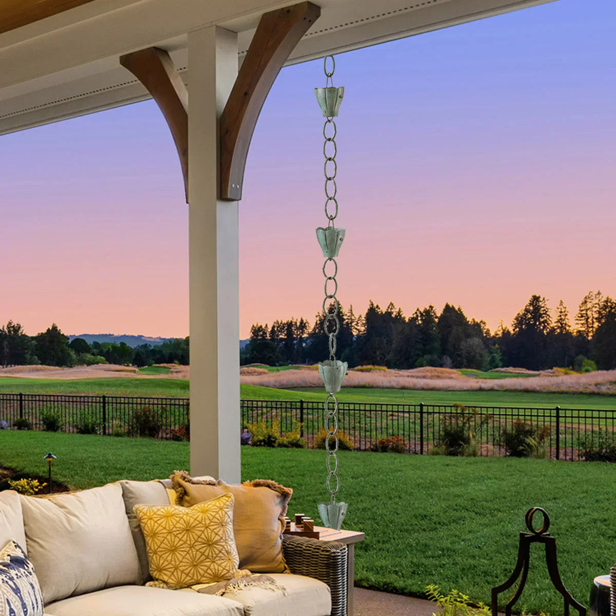 This Rain Chain from Good Directions is artistically-designed and handmade using pure copper to create a rain chain that is both beautiful and functional. The beautiful Blue Verde℠ finish on the copper achieves the look of aged copper. Wide, 3.25" crocus shaped cups link together wonderfully to form an 8.5' rain chain that promotes water flow and allows water to cascade beautifully from rooftop to ground.