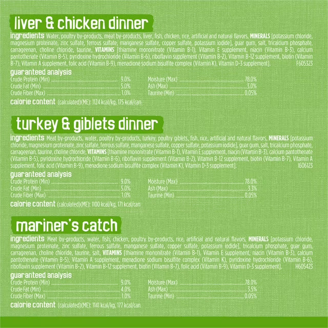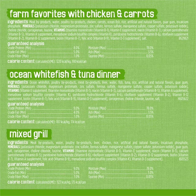 - Wet cat food variety pack featuring recipes made with essential vitamins and minerals providing 100 percent complete and balanced nutrition for adult cats with no artificial colors or preservatives
