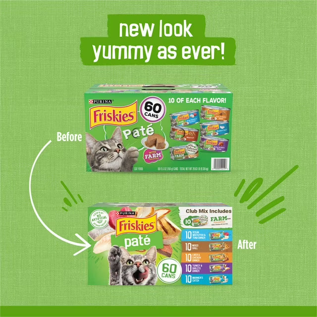 - 60-count moist cat food variety pack including wet cat food pate in six savory flavor combinations to delight her taste buds
