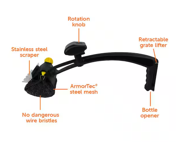 - Remove charred buildup with integrated stainless-steel scraper