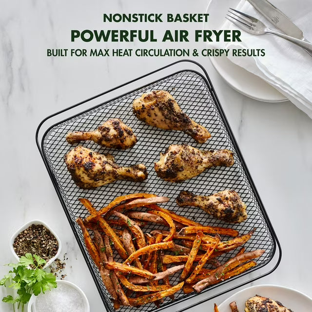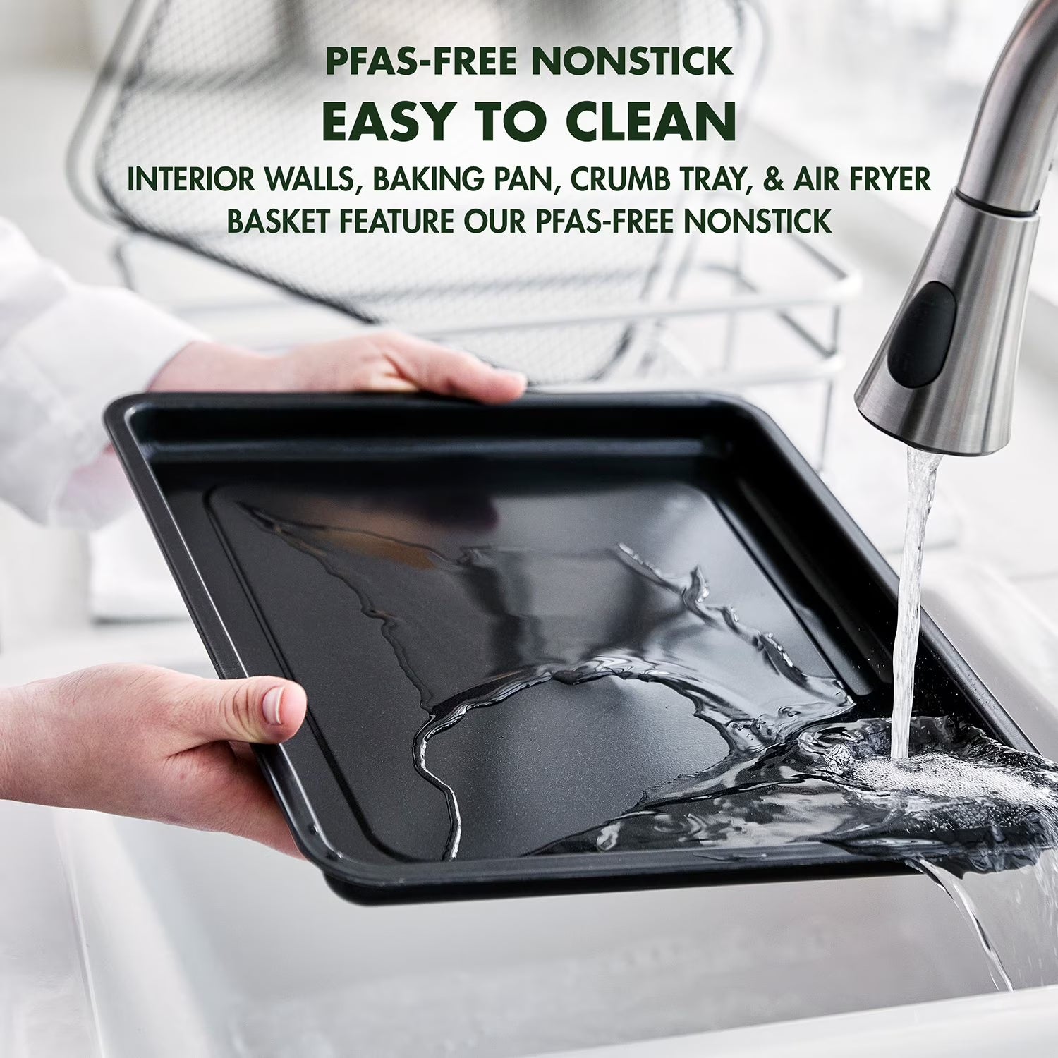 - Interior walls, baking pan, air fry basket, and crumb tray feature a nonstick coating for effortless cleanup