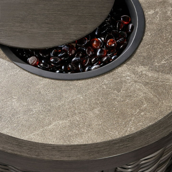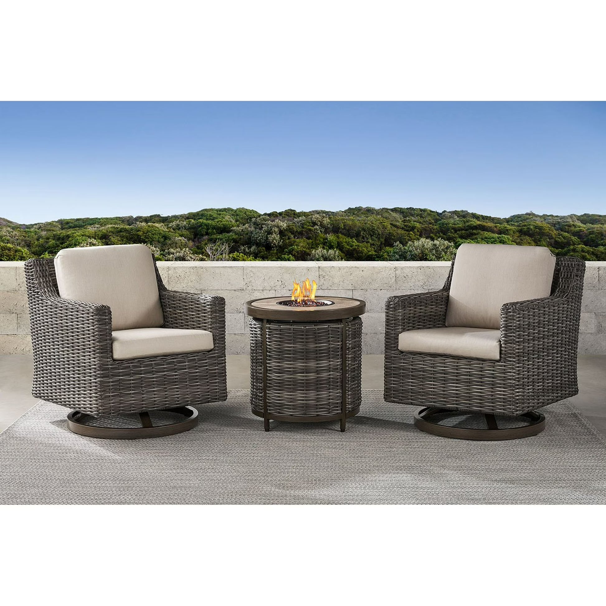 The Breck 3-piece chat set with fire pit offers a sophisticated, contemporary addition to your outdoor living space. Featuring two swivel rocker chairs and a fire pit table, it is meticulously handwoven from all-weather wicker for enhanced durability. Plush Sunbrella® Canvas Flax cushions provide superior comfort, while included patio covers protect your investment. Crafted with rust-resistant aluminum frames reinforced by extra welds, this set promises long-lasting strength. The fire pit table boasts a weather-resistant grouted porcelain tile top and includes a concealed LP tank compartment (tank not included) with easy push-button ignition and adjustable flames. Designed for both style and function, this patio set combines quality materials and refined craftsmanship for enduring outdoor enjoyment.
