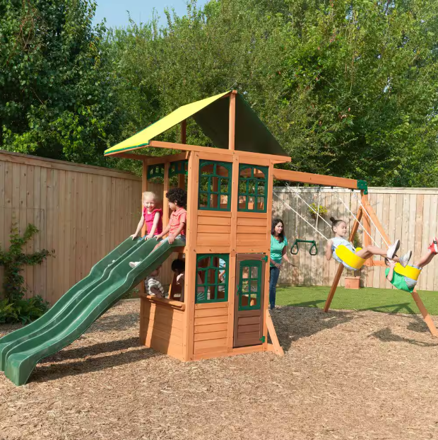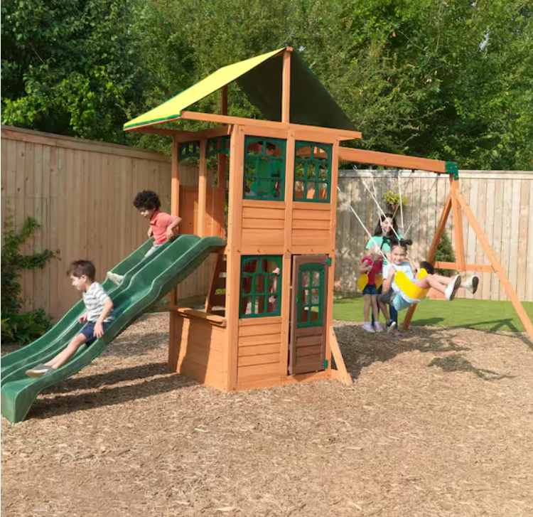 KidKraft's versatile Treasure Cove Play/Swing Set provides ample excitement for up to eight adventurous young pirates simultaneously. What young adventurer could possibly turn down the excitement of racing down high-rail wave slides side by side? Or skip the challenging rock-climbing wall. A duo of bright yellow belt swings and a gymnastic acro bar enable up to 3 adventurers to soar together at once. A double-decker clubhouse with a canopy roof provides ample shaded play area for those who prefer solid ground. A spacious cafe window features a serving ledge and a movable bench, perfect for tired young travelers looking for a snack. Crafted from 100% cedar lumber, Treasure Cove is adorned with a warm amber stain that is safe for children and kind to the environment. KidKraft swing parts feature robust brackets and hangers designed to ensure top-notch safety. The lumber comes pre-cut and pre-drilled, making assembly a breeze. For a creative outdoor play area that accommodates many, Treasure Cove makes it effortless.