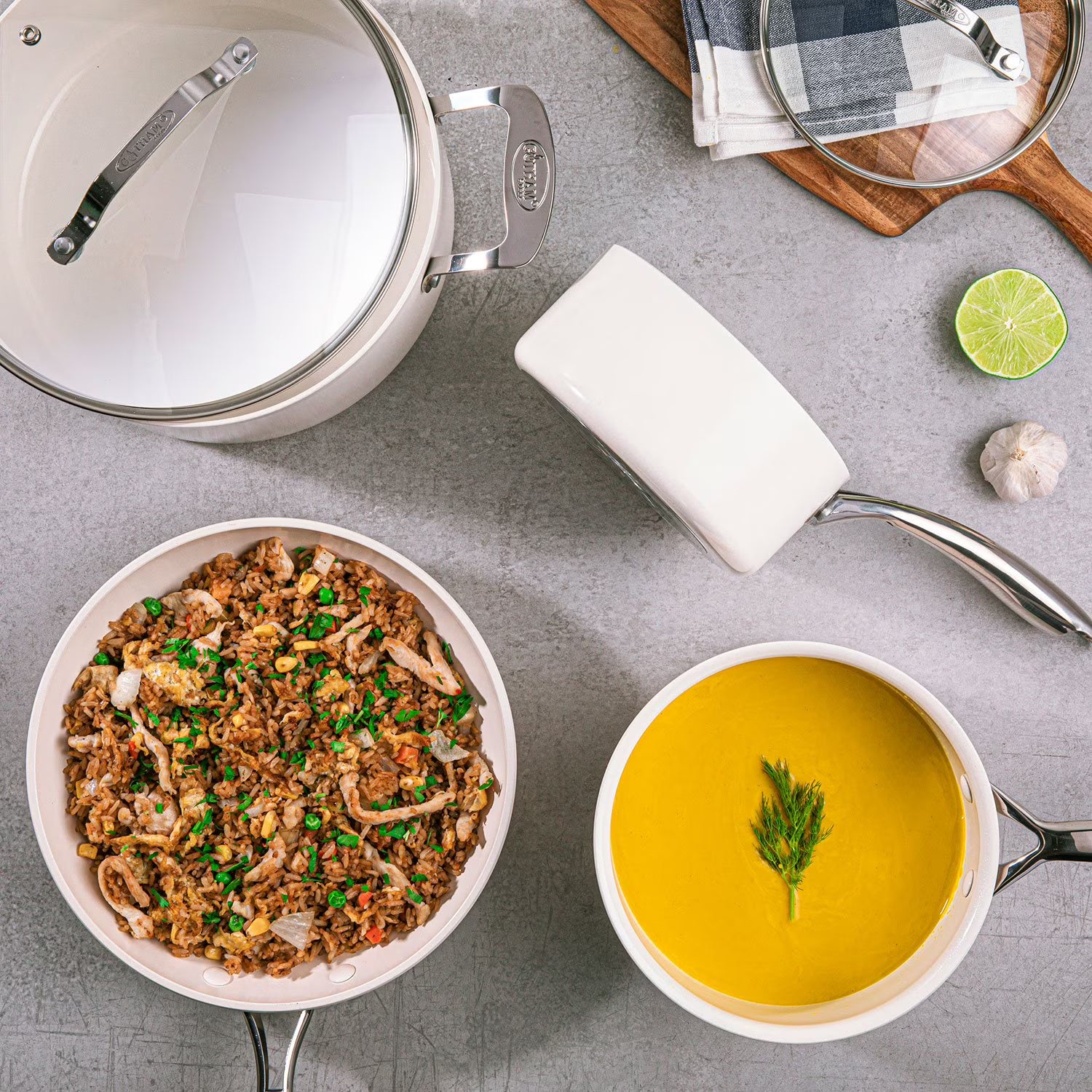 Elevate your kitchen with chic cookware that brings a modern aesthetic. Meet Gotham Steel Natural - where form seamlessly meets function. Designed with a scratch-resistant, nonstick ceramic surface, this cookware isn't just stylish; it's also committed to your well-being. Crafted to be non-toxic and health-conscious, it's made without PFOA, PFOS, PFTE, lead, or cadmium. Its nonstick surface allows you to cook without excess oil and butter, ushering in a healthier approach to cooking. Food slides effortlessly off the pan when used on low or medium heat as directed. And after your culinary adventures, cleaning up is a breeze-simply wipe them down or pop them in the dishwasher! Thanks to a durable interior, your dishes heat up swiftly and evenly, while the stay-cool handles make maneuvering a breeze. Take the transition from stovetop to oven to table in stride, as this set is oven safe up to 500หF. Whether it's for college grads, a newlywed registry, housewarming, or a vacation rental, this set serves as a wonderful gift option. Take your kitchen to the next level with a set that makes cooking an art.