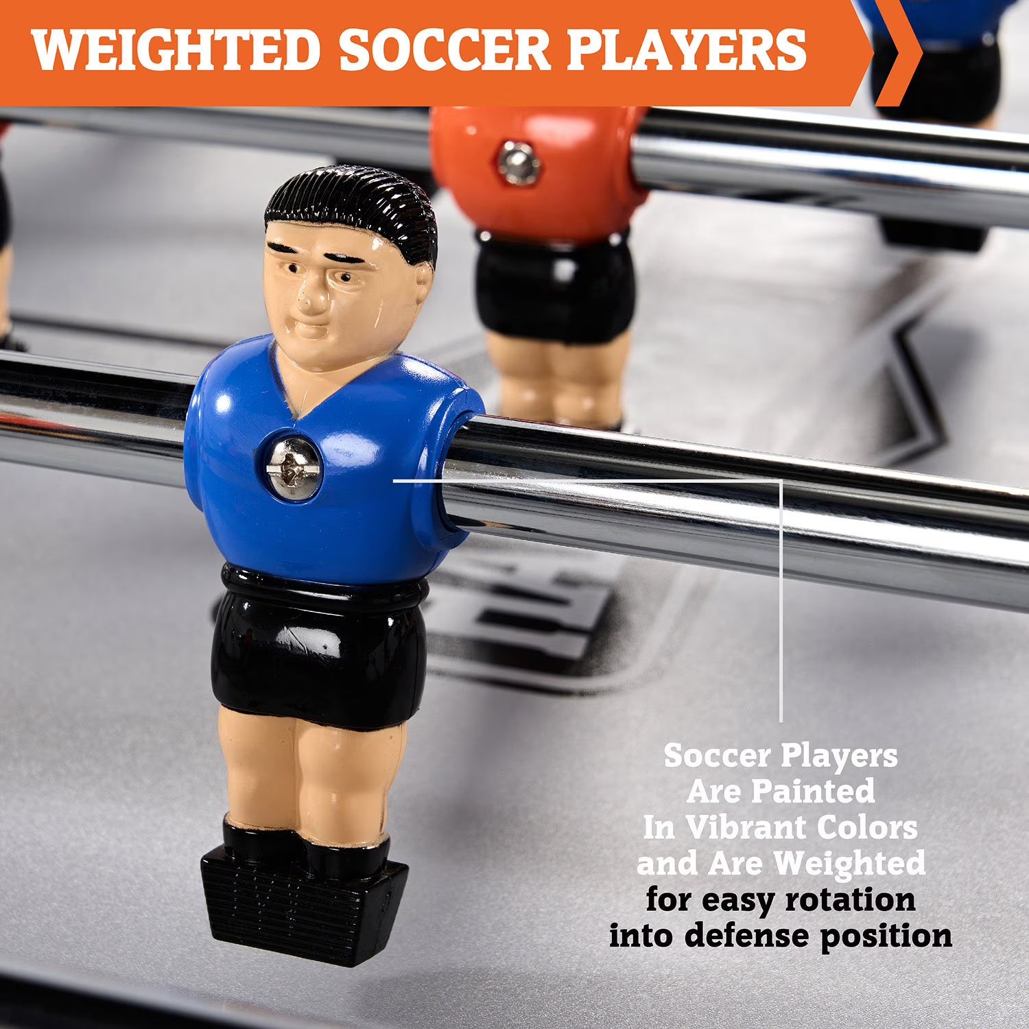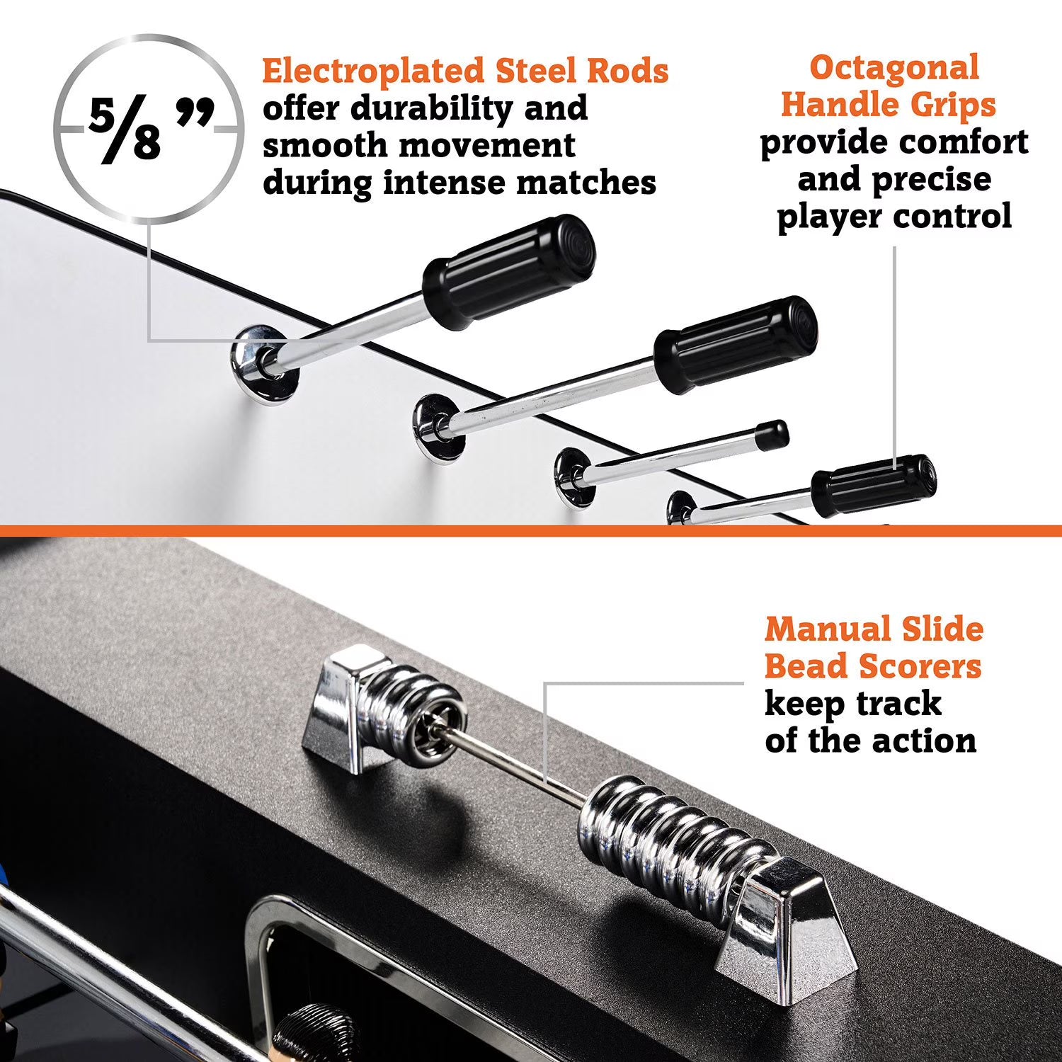 Intense Game Play: The 5/8” steel rods on this foosball table glide over plastic metal capped bearings and have a hollow design and non-slip octagonal handles for ball control. Sideline ramps keep the ball moving on the PVC laminated, 12mm MDF playfield.