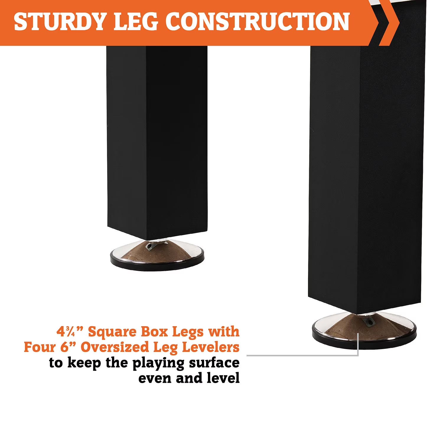 Craftmanship: The foosball table is coated with scratch-resistant white PVC laminate over MDF. Reinforced aprons with an ABS seal add strength and support. Goal boxes return your tabletop soccer ball after each goal, and a traditional bead-style slide scorer tracks the action.