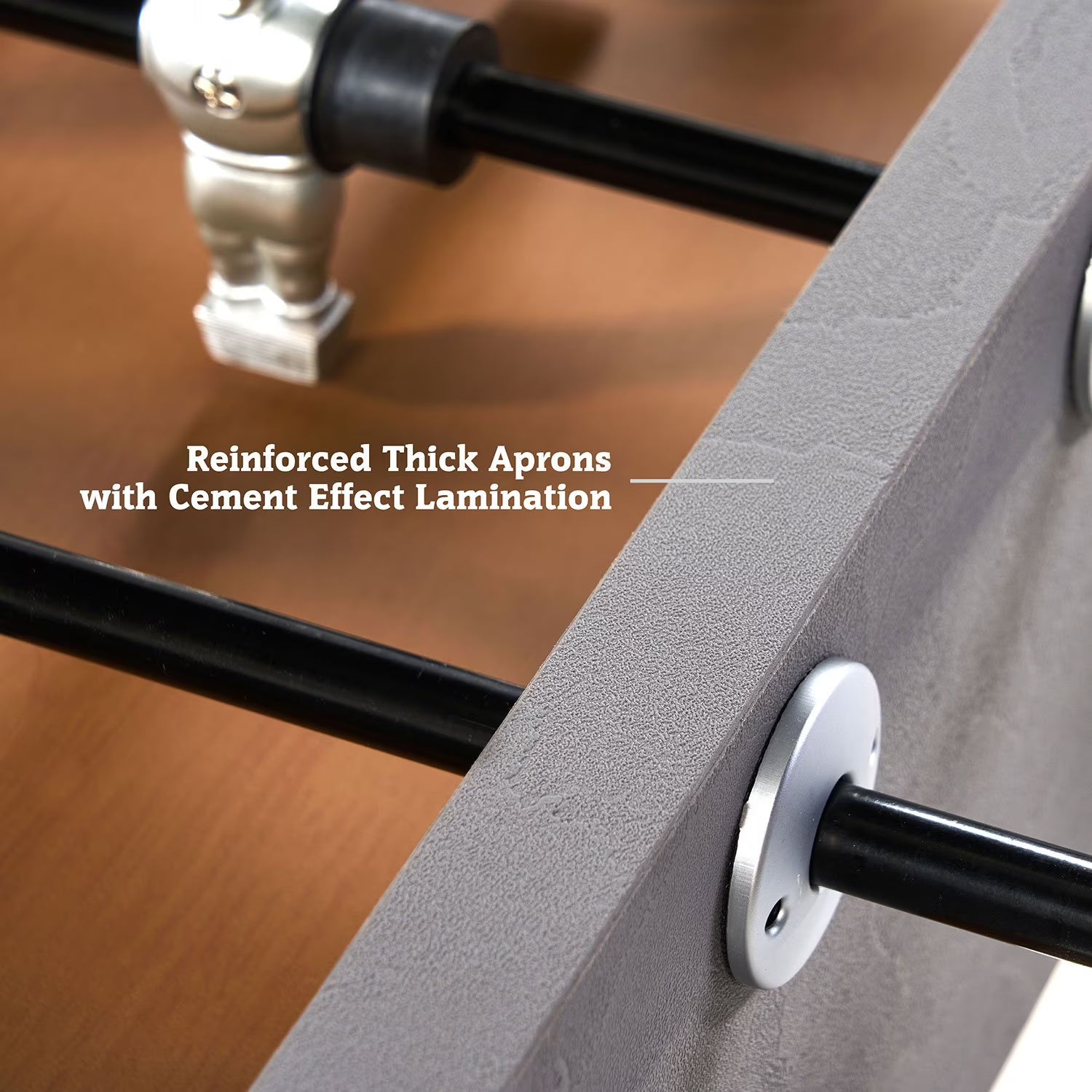 Craftmanship: The foosball table has a scratch-resistant PVC laminated concrete style finish over MDF. Goal boxes return your tabletop soccer ball after each goal, and a traditional solid wood square bead-style slide scorer tracks the action.
