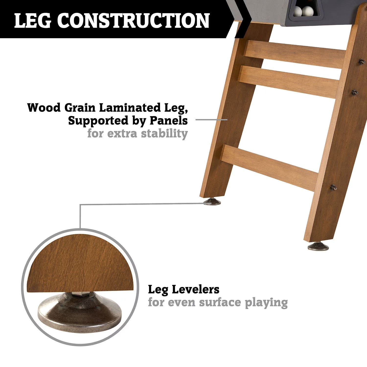 Sturdy Leg Design & Room Size: The recommended game room size is 9’ x 8’ to allow for movement around the foosball table when playing. The 13 silver and 13 black weighted robot-style players are assembled onto the game rods and ready for battle. The game table is supported by sturdy wood grain laminated legs with cross panels for extra stability. The legs have adjustable 2.5” leg levelers to keep the playing surface balanced and level.
