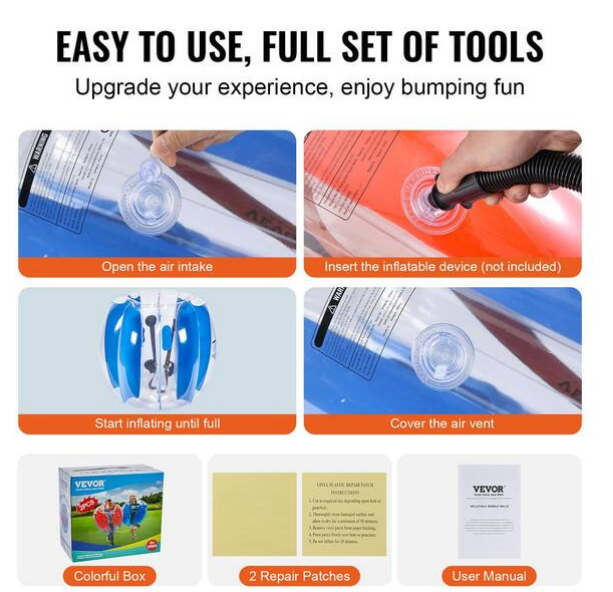 These 3-foot inflatable bumper balls deliver robust entertainment with professional-grade construction. Built from 0.3mm thick, explosion-proof PVC, they resist tears and air leaks while maintaining durability through extended play sessions. The advanced valve system ensures reliable sealing for consistent performance. Designed for children ages 6 and up (heights 3.6-5.2 ft., weights 110-330 lbs.), these zorb balls feature ergonomic soft handles and adjustable shoulder straps that distribute pressure evenly for secure, comfortable wear. The included repair kit with two patches extends the product lifespan, addressing minor damage quickly. Each inflation lasts approximately 12 hours. Kids Outdoor/indoor Play Toys. Versatile for solo or group play, these bumper balls suit gardens, backyards, playgrounds, and recreation centers toy. The set includes an instruction manual and repair patches for immediate use and maintenance. Kids Outdoor Playset