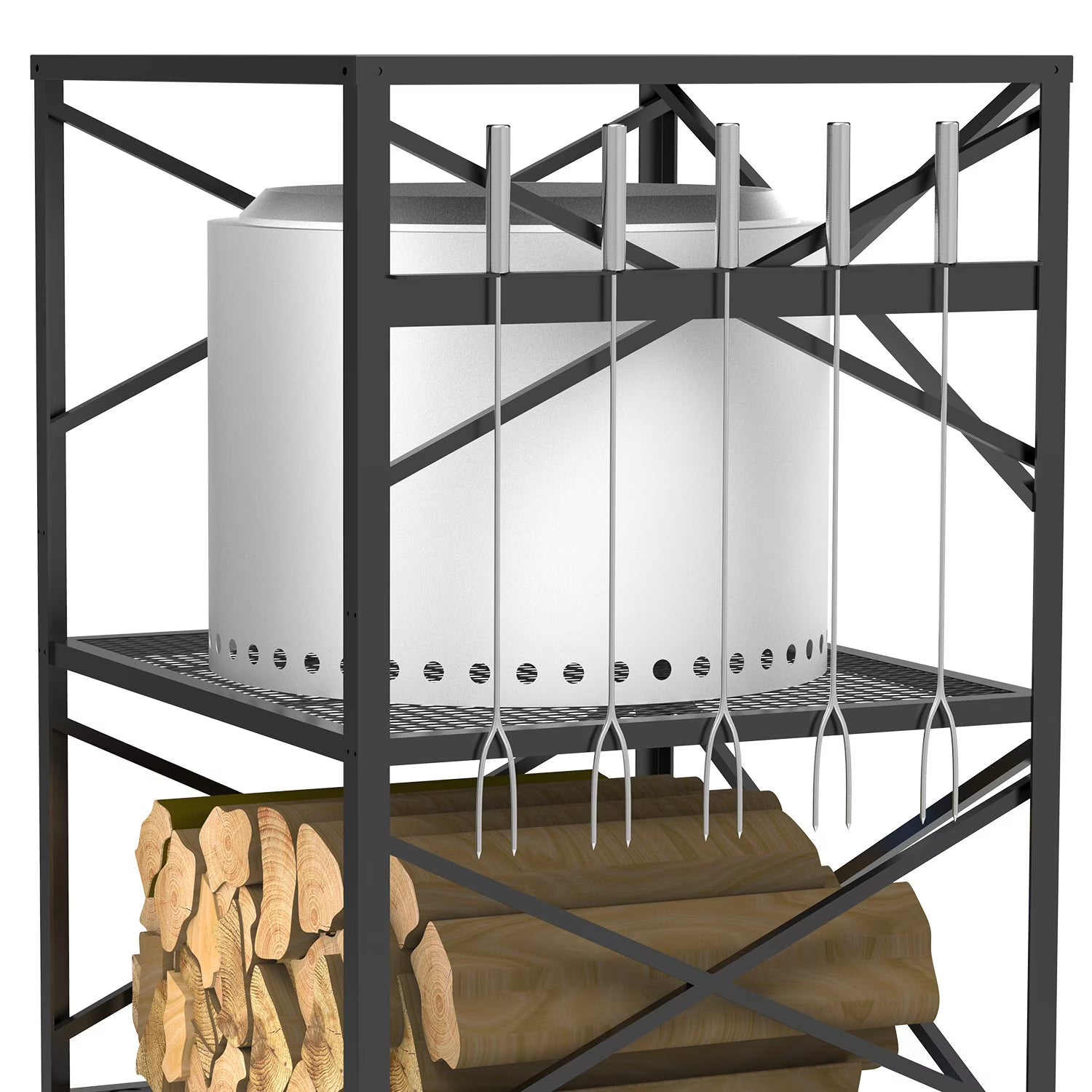 - Adjustable shelves can fit most fire pits, firewood, kindling and more