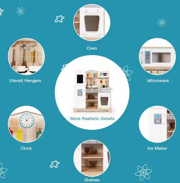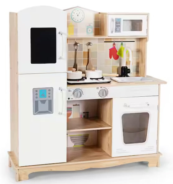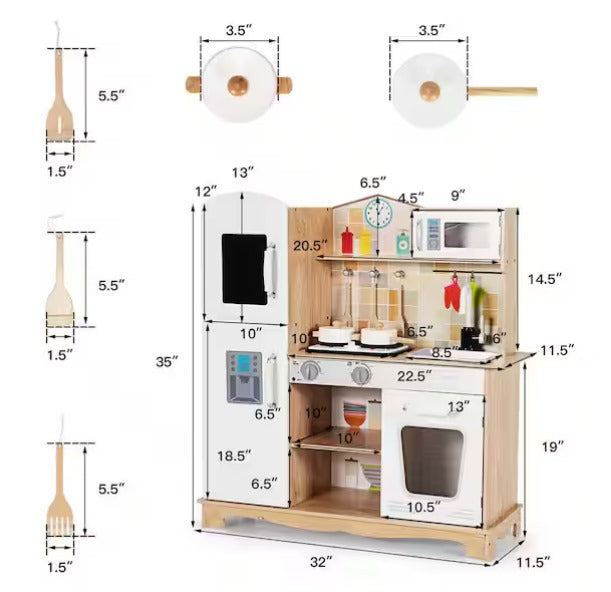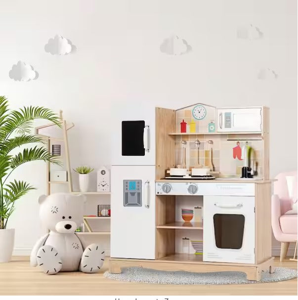 This wooden Kids kitchen Playset transforms imaginative cooking into an engaging developmental tool. Featuring a 180° rotating faucet, illuminated stovetop with sound effects, and realistic appliances, it captivates young chefs while building independence, communication, creativity, and motor skills. The premium MDF construction is ASTM-certified, odorless, and non-toxic—safe for sensitive skin and built to withstand years of play. Multiple storage compartments across open shelving, oven, microwave, and ice maker encourage organizational thinking. Arrives fully assembled with three spatulas, one pan, and one lidded pot. Dimensions: 32"L x 11.5"W x 35"H. Ideal for ages 3–7 Best Kids Playset Toys.