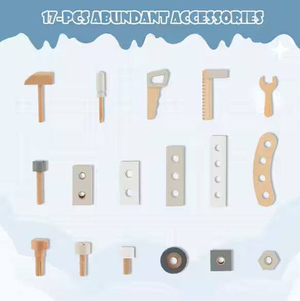 Introduce young builders to hands-on construction play with this comprehensive wooden workbench featuring 61 accessories. The set includes essential tools like hammers, saws, wrenches, and screwdrivers that assemble and disassemble for endless creative possibilities. Crafted from quality beech wood and basswood with meticulous attention to detail, the sturdy design withstands years of active play while smooth, rounded edges ensure safety for small hands. The 18-inch-tall table accommodates children ages 3 and up, with an organized tabletop featuring tool slots and a lower storage compartment for efficient toy management. This workbench cultivates fine motor skills, spatial reasoning, and imaginative thinking while teaching fundamental tool concepts and organizational habits. An ideal gift for birthdays, holidays, and developmental milestones.