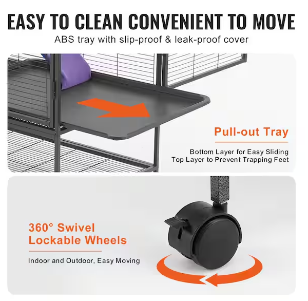 The Large 2-Tier Critter Nation Cage delivers 30.3" x 20.5" x 36.2" of premium habitat space, engineered with reinforced metal square tubing and fine powder coating for exceptional durability and rust protection. The 1/2" mesh spacing securely contains ferrets, chinchillas, guinea pigs, hedgehogs, and small kittens while the fabric-covered non-slip ramp encourages natural climbing and exercise. Removable platforms and the pull-out ABS-coated bottom tray streamline maintenance and prevent urine leakage, while dual-layer doors with an openable top window facilitate effortless feeding and interaction. Lockable rolling wheels enable seamless repositioning between indoor and outdoor environments, and the integrated storage shelf above the wheels keeps supplies within reach. Screw-in door latches and tight-fitting components ensure your pet remains safely contained while you enjoy convenient access and cleaning.