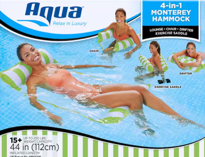 There's nothing better than a lazy day outside perfecting your tan and cooling off from the summer sun. Get comfy in the water with Inflatable 4-in-1 Pool Hammock Floating Lounger. Recommended for floaters 4 ft. to 6 ft. tall or up to 250 lbs. Completely customize your riding style in a seat that rests in the water. Whether you're looking to sit, lay, drift or saddle-up, this versatile pool float delivers. Stretch the fabric to ride hammock-style, sit chair or saddle-style or fold the inflatable to drift around the water. The seat rests in the water to make it super easy for you to change positions or hop on/off. High-buoyancy pillows meet mesh fabric that keeps you comfortably suspended in the water and contours to your desired position. Great for the pool, lake or ocean, the Inflatable 4-in1 Pool Lounger is compact and easy to bring on-the-go.