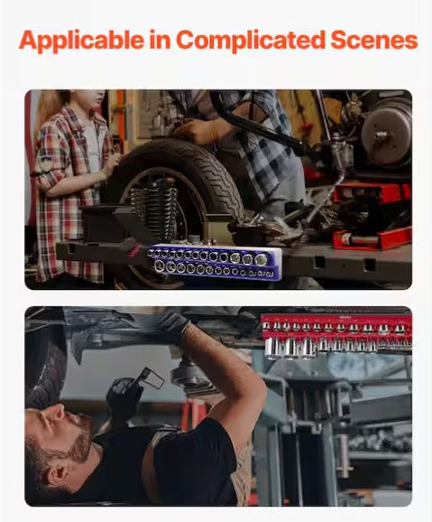 This 4-piece magnetic socket organizer set delivers comprehensive storage for 108 metric and SAE sockets across multiple drive sizes. Color-coded trays—blue for metric, red for SAE—streamline identification and inventory management. The reinforced ABS construction withstands heavy workshop use, while the durable 5mm ferrite magnetic base securely anchors to metal surfaces without shifting. Permanent size labels remain legible through years of daily use. Engineered for professional environments including auto repair shops, factories, and serious home workshops, this system eliminates socket loss and maintains workspace organization. Accommodates SAE sizes 1/8" to 5/8" (1/4" drive) and 1/4" to 1" (3/8" drive), plus metric 4-14mm (1/4" drive) and 6-20mm (3/8" drive). Sockets sold separately.
