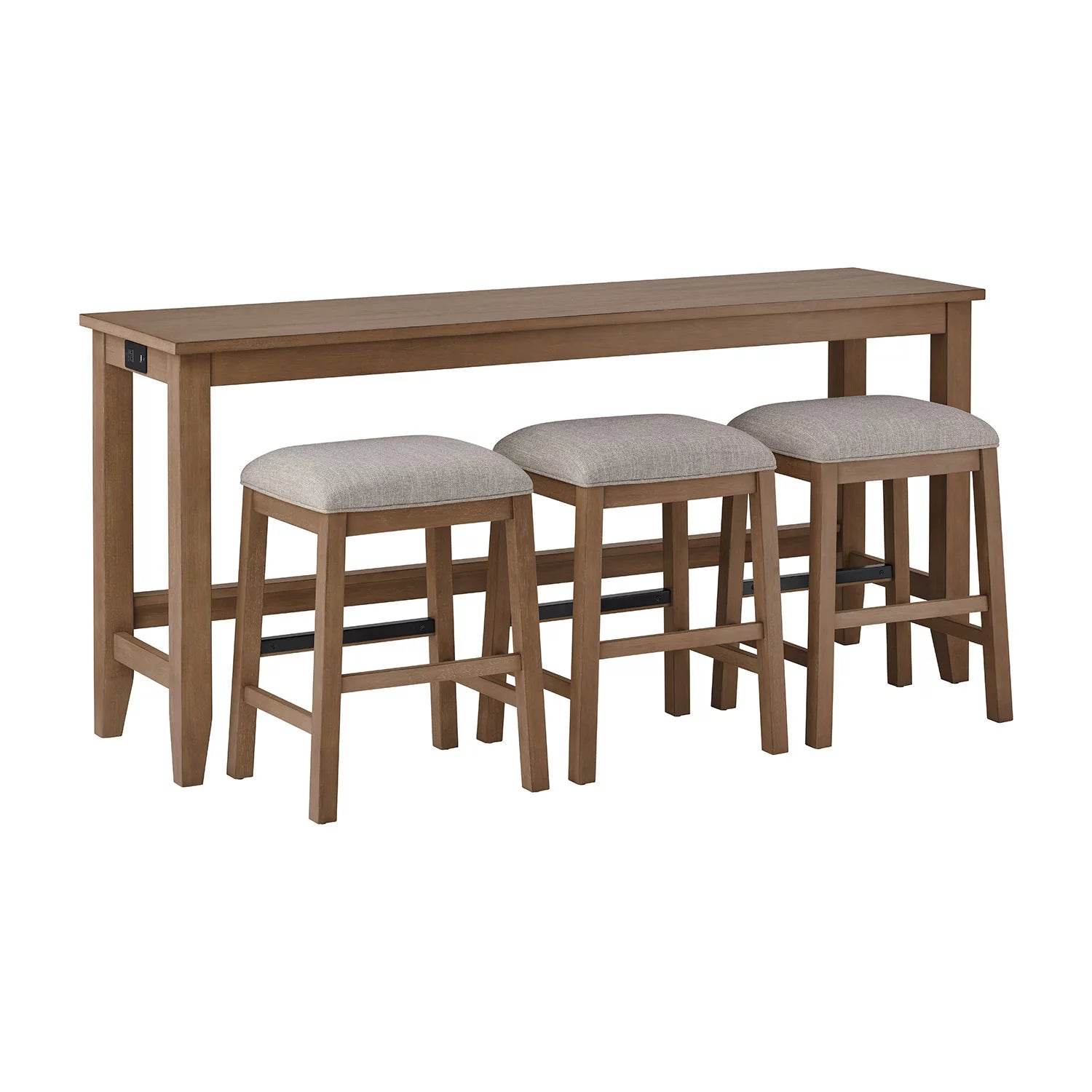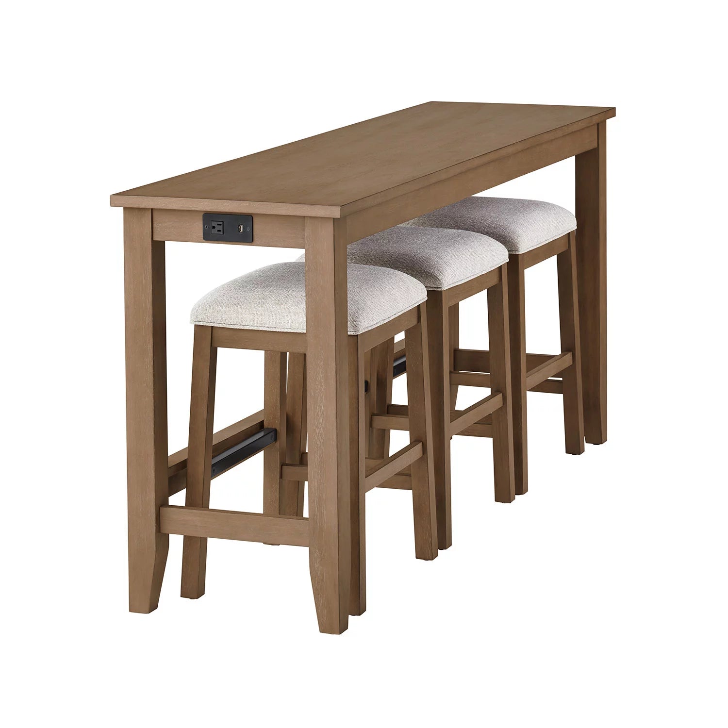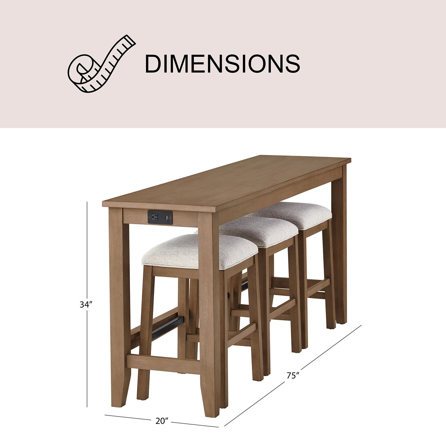 The 4-piece set includes a generously sized table and three exquisitely upholstered stools in a light gray hue, that provides inviting seating for you and your guests. The plush pillow-top seats redefine comfort, while the thoughtfully positioned footrests enhance stability.