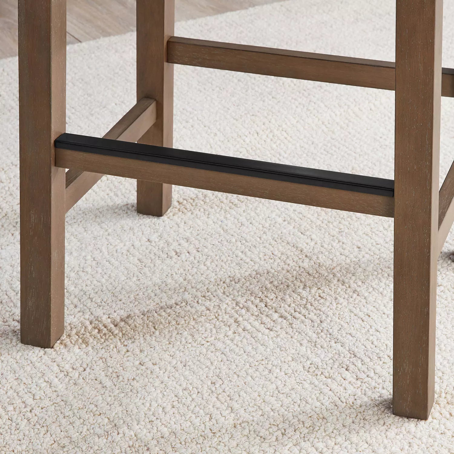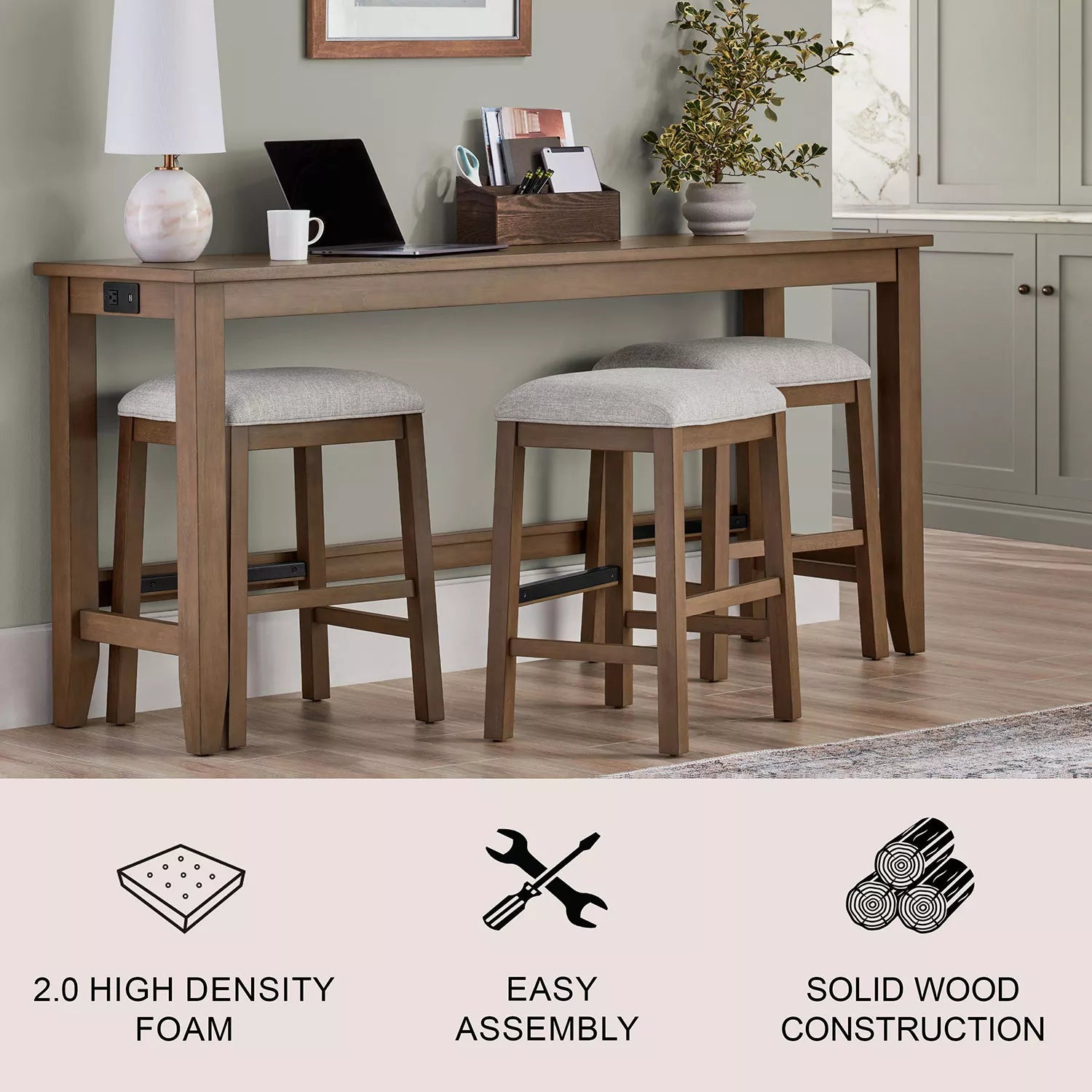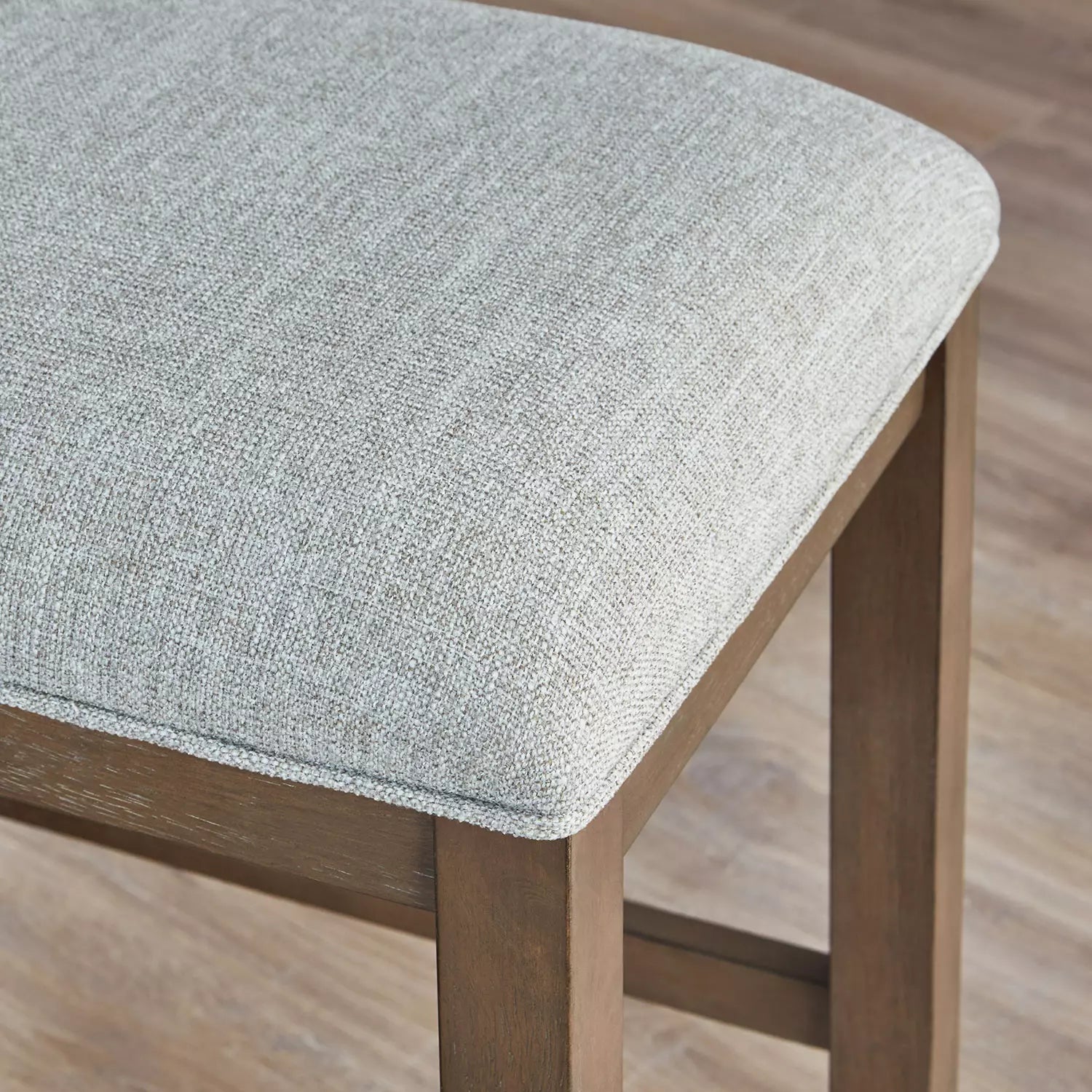 The 4-piece set includes a generously sized table and three exquisitely upholstered stools in a light gray hue, that provides inviting seating for you and your guests. The plush pillow-top seats redefine comfort, while the thoughtfully positioned footrests enhance stability.