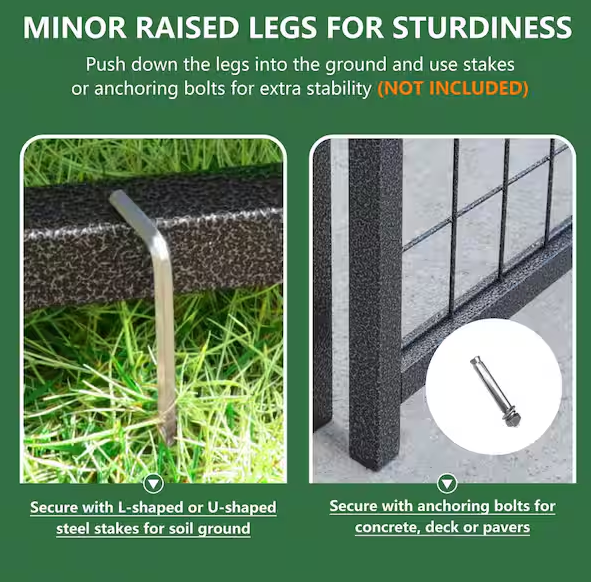 This premium outdoor dog enclosure features a robust power-coated welded steel frame with water-resistant canopy, engineered to withstand harsh weather and resist rust and chewing damage. The innovative dual rotating feeding doors with integrated bowl holders and two 900ml stainless steel bowls allow you to feed your pet without opening the main gate. UV and water-resistant roof material shields against sun, rain, and snow while preventing deterioration, with a sloped design that eliminates water pooling. The structure measures 48"W x 95.8"D x 72"H with convenient rotating feeding windows (19"W x 10.3"H and 15.3"W x 10.2"H). Tool-free assembly and disassembly make setup effortless, though expansion is limited to matching sections only and cannot include the roof.