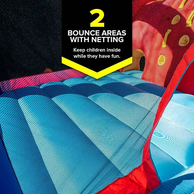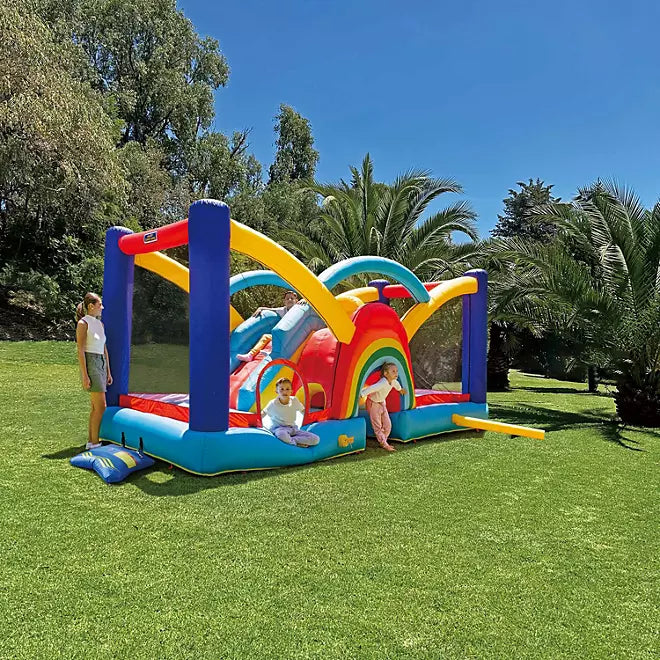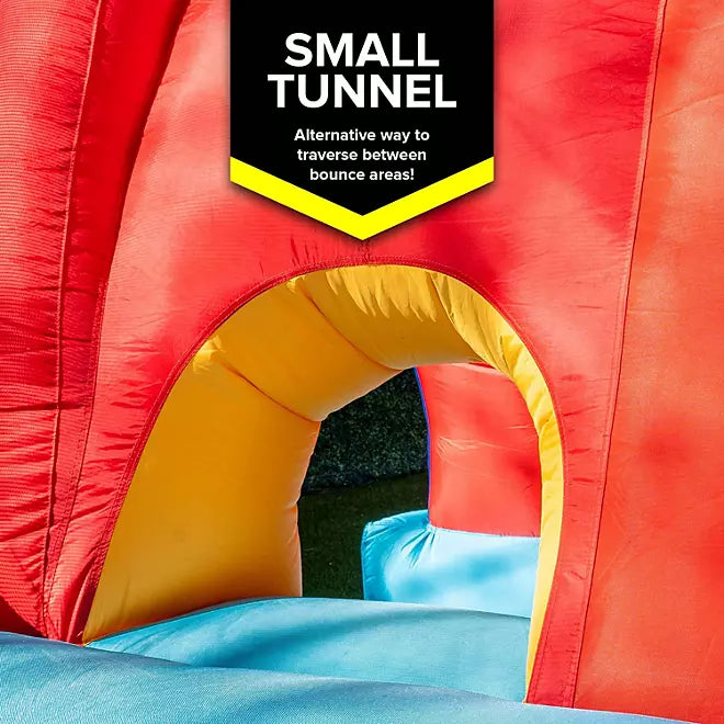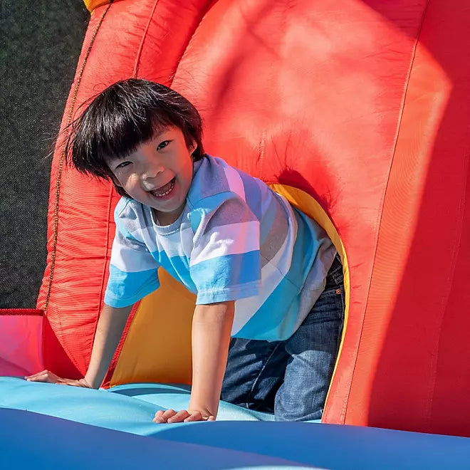 The My 1st Jump N Play Rainbow Bounce House is a vibrant and entertaining addition to your backyard that your kids will absolutely adore. Equipped with two expansive bounce areas, a slide, climbing wall, and tunnels, it offers multiple play options for your children. Kids can enjoy bouncing in one area, climb up the wall, and then slide down into the second play area.