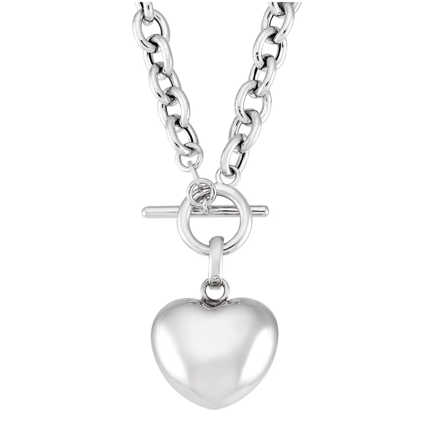 This striking sterling silver necklace features a generously proportioned puffy heart pendant suspended from an elegant oval link chain, secured with a distinctive round toggle closure. Weighing nearly 20 grams despite its hollow construction, the piece demonstrates exceptional craftsmanship through precisely assembled links that ensure lasting durability. The high-polished finish delivers a luxurious aesthetic that commands attention as a standalone statement or layers beautifully with complementary pieces. Heart symbolism—representing love, devotion, and meaningful connection—makes this pendant a meaningful choice for personal wear or gift-giving. Sterling silver's inherent qualities of brilliance, rarity, and workability create a timeless accessory designed to endure. Maintain its lustrous appearance with gentle care using mild soap, soft water, and a delicate cloth; periodic professional maintenance preserves the integrity of your investment piece.