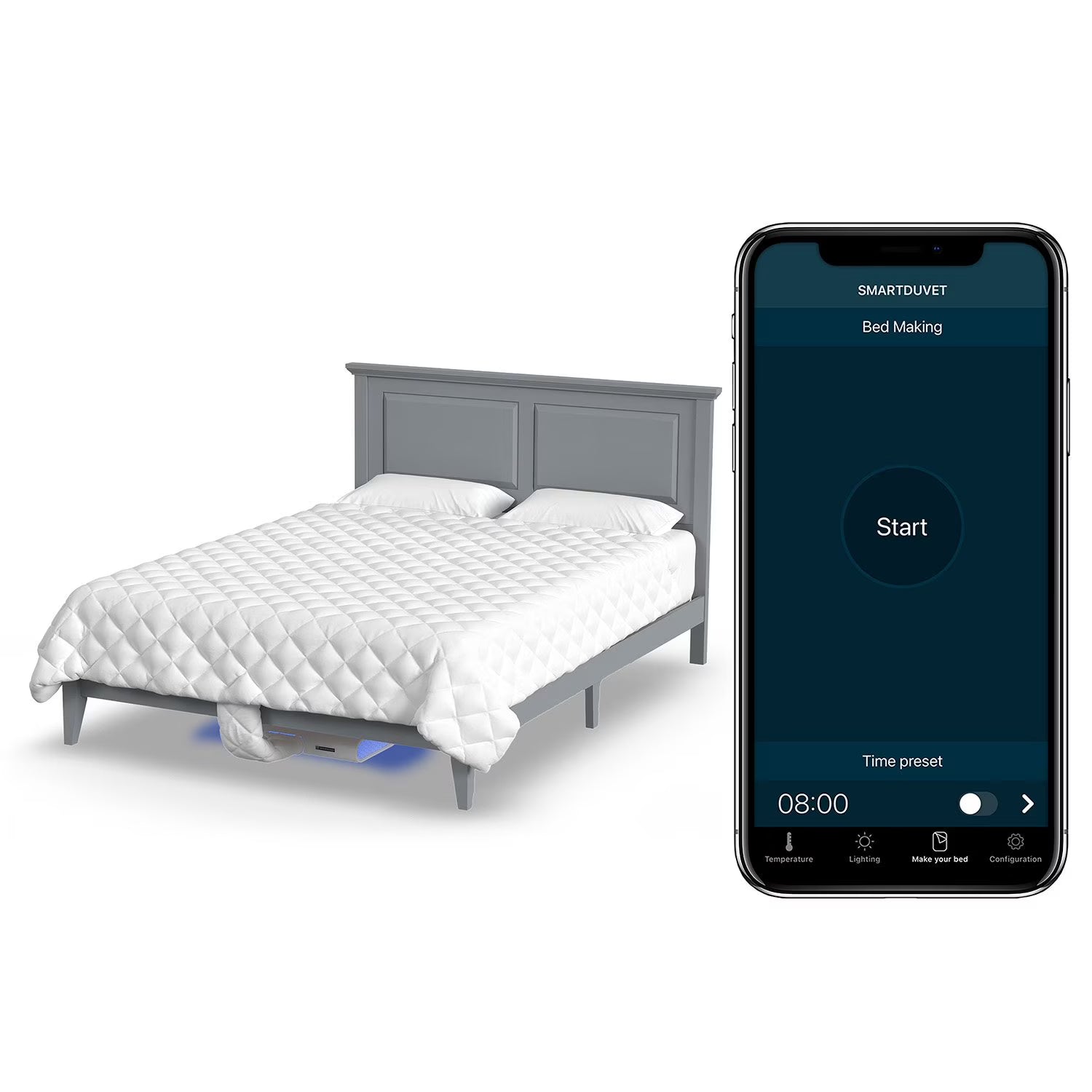 The SmartDuvet revolutionizes sleep through dual-zone temperature management, allowing each side of the bed to maintain independent settings from 65°F to 80°F. Advanced dry air circulation technology minimizes allergens while maintaining optimal moisture levels throughout the night. The self-making feature automatically smooths and straightens your duvet via app control or scheduled automation. A discreet control unit houses customizable LED ambient lighting and an essential oil diffuser to personalize your sleep environment. Machine washable construction ensures effortless maintenance. Engineered for couples seeking temperature harmony and individuals prioritizing sleep quality, the SmartDuvet combines intelligent climate control with practical convenience to transform your nightly rest.