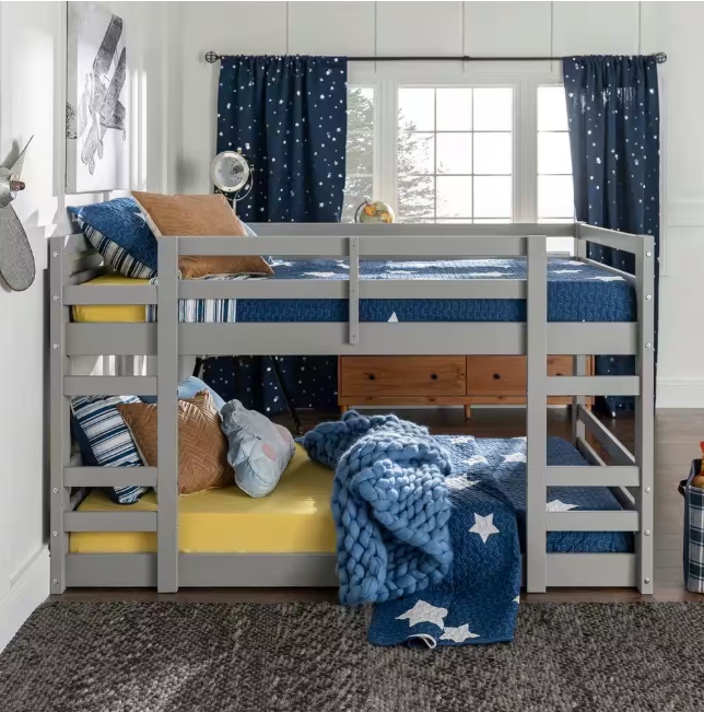 This low solid wood twin over twin bunk bed blends traditional and transitional design for a timeless look, tailored to small spaces. Constructed from solid pine with a smooth painted finish, it features safety guardrails and a double ladder for secure access. The lower bunk sits directly on the floor, making it ideal for young children, while sturdy wooden slats provide reliable mattress support without the need for a box spring. With dimensions of 46.13" H x 77.87" L x 46.5" W and weighing 110 lbs, it arrives ready-to-assemble with clear, step-by-step instructions.