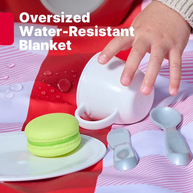 - Picnic basket and 29-piece play food accessory set with water-resistant picnic blanket