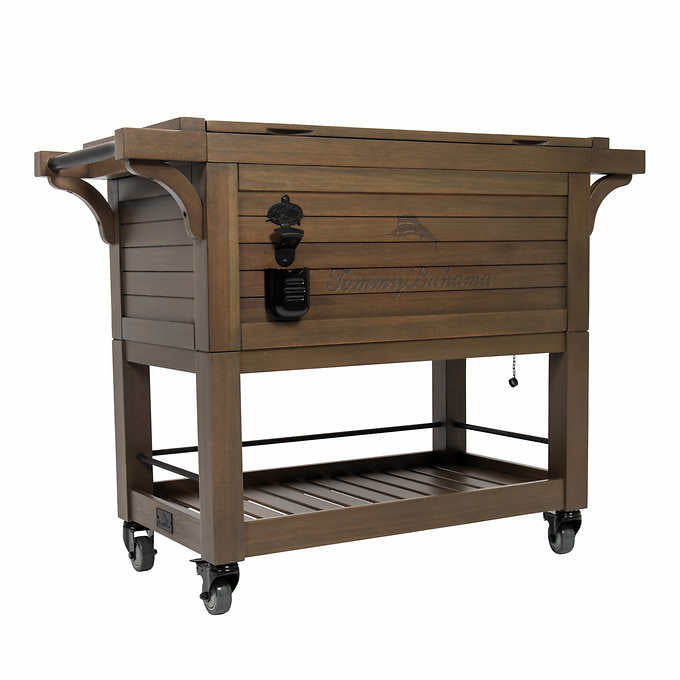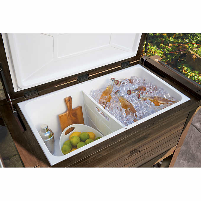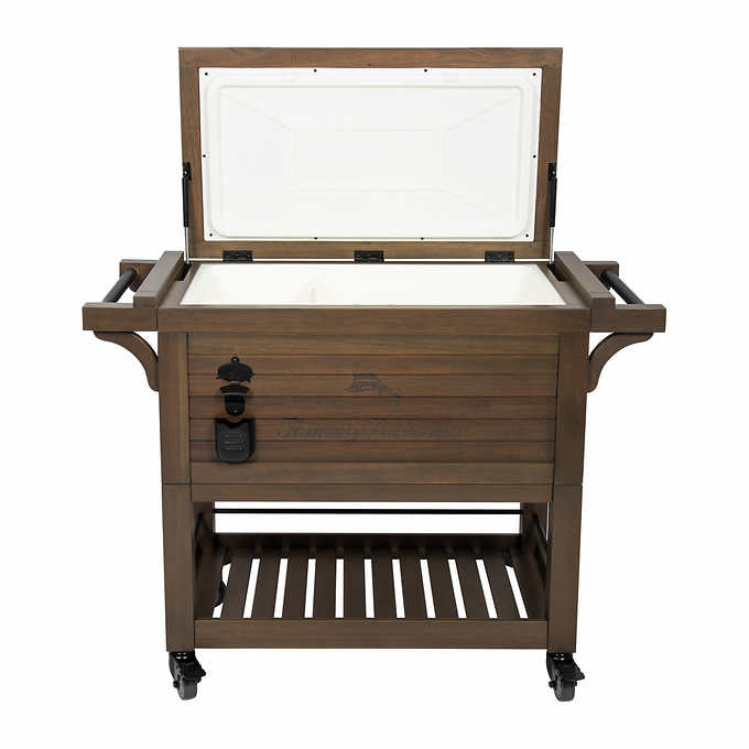This rolling cooler will make outdoor picnics and barbecues a breeze! It features stainless steel hardware, safety hinges, and a eucalyptus wood body and frame that are well insulated to keep items cold. It's capable of storing 130 cans and also comes with a bottle opener and cap catcher.