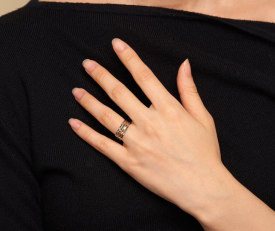 The polished and diamond cut rings in yellow, white, and rose gold enable it to match any outfit. Seven 14k gold rings come together to form this gorgeous piece of jewelry.