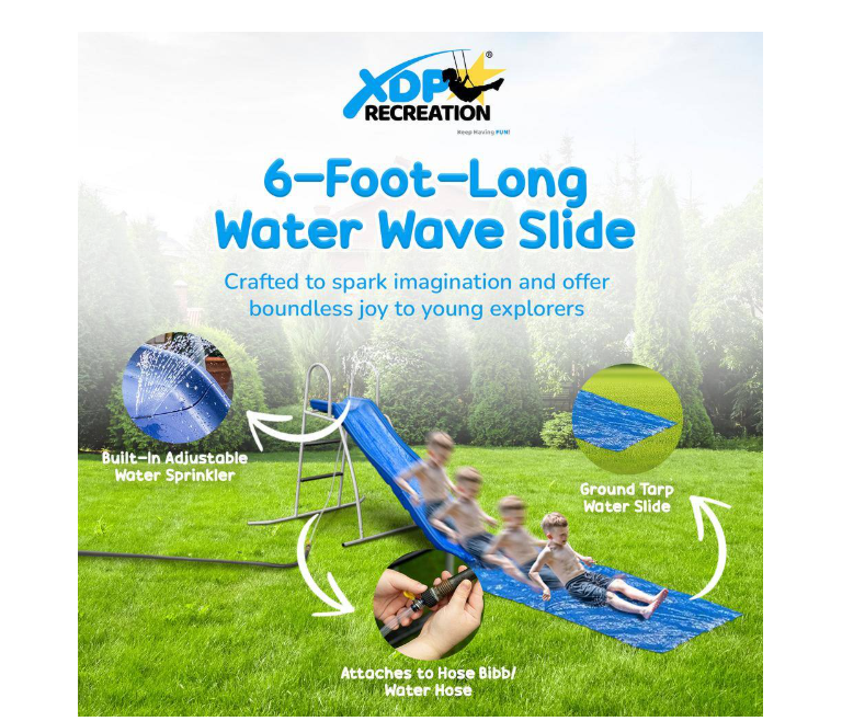 Embark on an aquatic adventure in your backyard with this exhilarating 6 ft. Water Wave Slide from XDP Recreation. Designed to ignite the imagination and bring endless joy to young adventurers aged 3 to 8, this vibrant slide promises a fantastic experience. Create your kids a cascading rush of cool, refreshing water that greets eager sliders as they glide down the smooth, undulating waves. With its built-in adjustable water sprinkler, every twist and turn is met with a delightful shower, turning ordinary playtime into an aquatic escapade. But the fun doesn't stop there. This versatile wonder isn't just for wet days. It is equally thrilling when dry and offers boundless excitement for little kiddos, rain or shine. Thanks to its free-standing design and easy attachment to any hose bibb or water hose, setting up is a breeze, ensuring non-stop fun whenever the mood strikes. Security is a top priority, which is why the Water Wave Slide meets ASTM standards, giving parents peace of mind as their children frolic and play. Plus, with adult assembly required, caregivers can rest assured that setup is a snap. Unleash the laughter, unleash the adventure and make memories that will last a lifetime with this XDP Recreation 6 ft. Water Wave Slide, the ultimate backyard oasis for young explorers everywhere. Dive in and let the good times flow.
