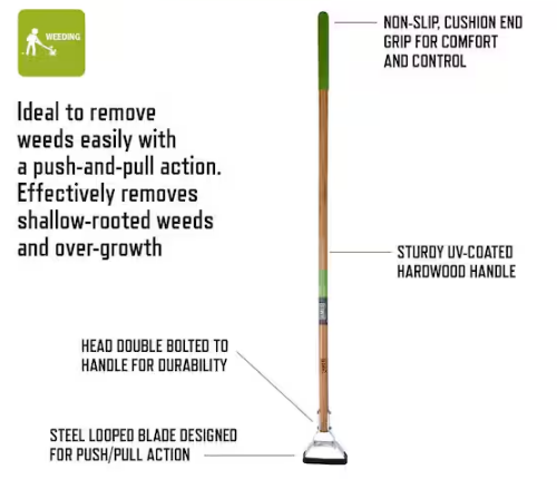 - Weeding hoe features looped blade for push and pull action to easily remove weeds and a durable double-bolt connection