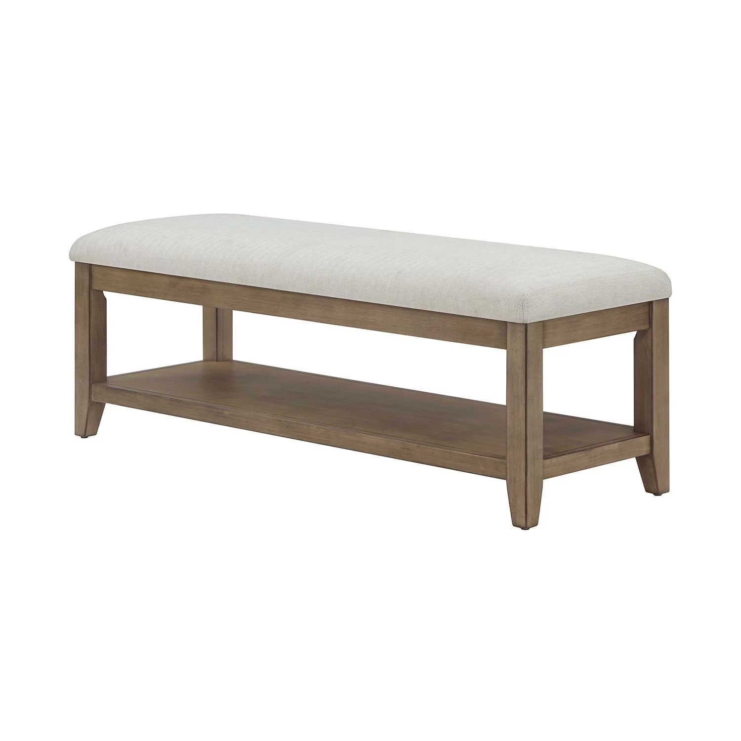 Beige Fabric Upholstery and Wood Bench with Lower Storage Shelf