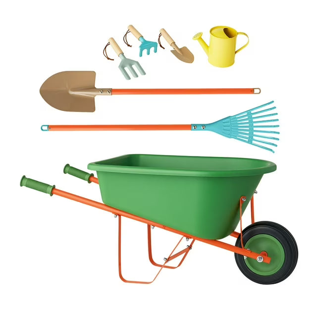 - Includes a wheelbarrow, shovel, rake, trowel, small fork, small rake and watering can for comprehensive gardening play.