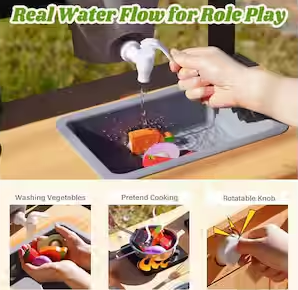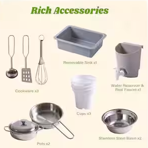 - Complete kitchen accessories: the set includes 3 cups, a water reservoir with a real faucet, a removable sink, 2 stainless steel basins, 2 pots, and 3 pieces of cookware, these accessories add a realistic touch to pretend cooking