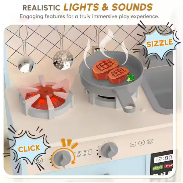 This wooden play kitchen combines safety, interactive features, and imaginative play in one compact design. Built from ASTM and CPSIA certified materials with non-toxic, BPA-free finishes, it meets strict safety standards while providing years of durability. Kids love the dual light-up stovetops with sound effects, working microwave, double ovens, coffee maker, and rotating faucet that bring realistic cooking experiences to life. The included 24-piece accessory set—featuring toy foods, utensils, and cookware—lets multiple children play together seamlessly. An anti-tip frame, rounded corners, and sturdy construction ensure stability during active play. The pull-out fabric drawer teaches organization while keeping accessories neatly stored. Easy assembly with step-by-step instructions and QR video makes setup quick. Perfect for apartments and small spaces, this kitchen sparks creativity, builds fine motor skills, and encourages social interaction through imaginative role-play.