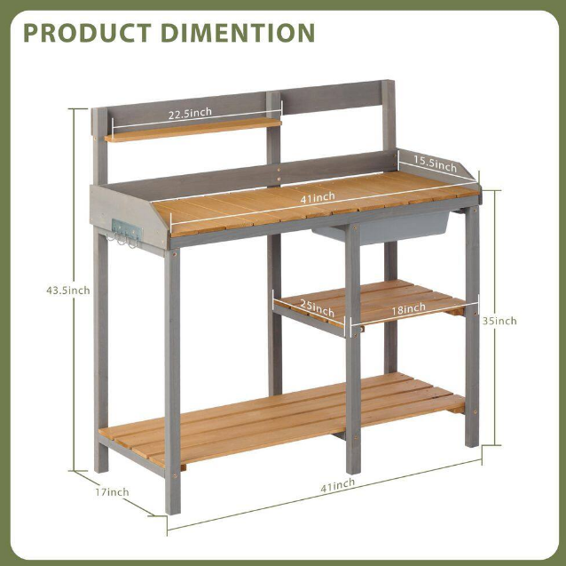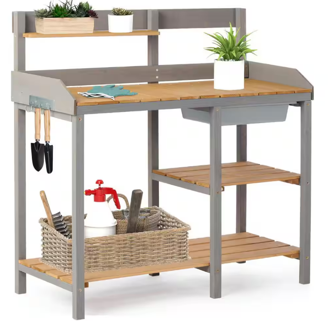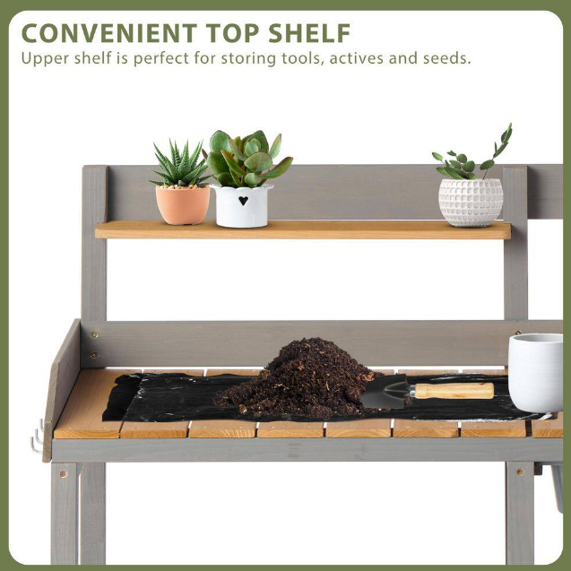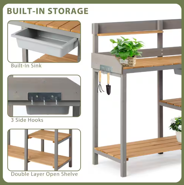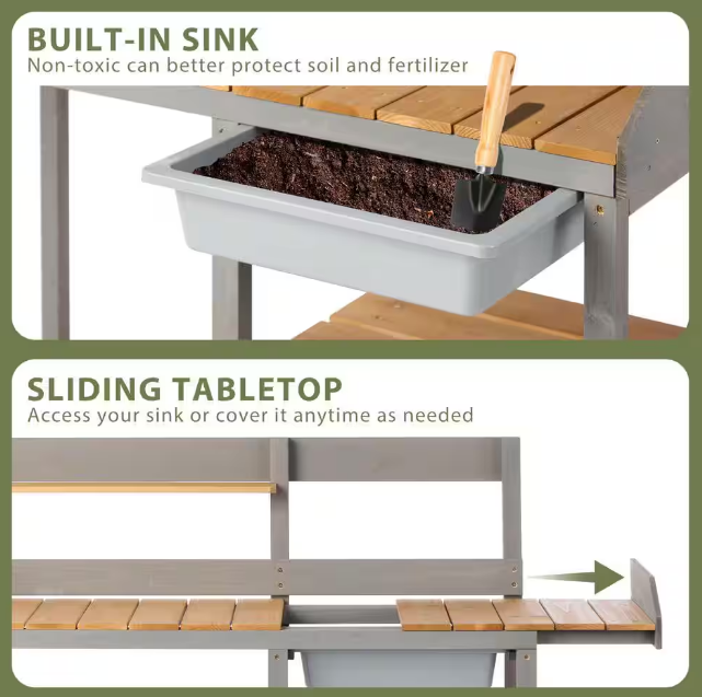 Our Potting Bench Table is a perfect blend of functionality, style, and durability. Crafted from premium solid wood and finished with a water-based coating, this bench is designed to withstand outdoor conditions and provide long-lasting use. With spacious double shelves and an innovative sliding tabletop with a built-in dry sink, it ensures your gardening tools and essentials are neatly organized and easily accessible. The classic farmhouse design enhances any outdoor space, making it a versatile addition to your garden. Whether you're potting plants or storing gardening supplies, this table offers the perfect workstation for all your gardening needs.